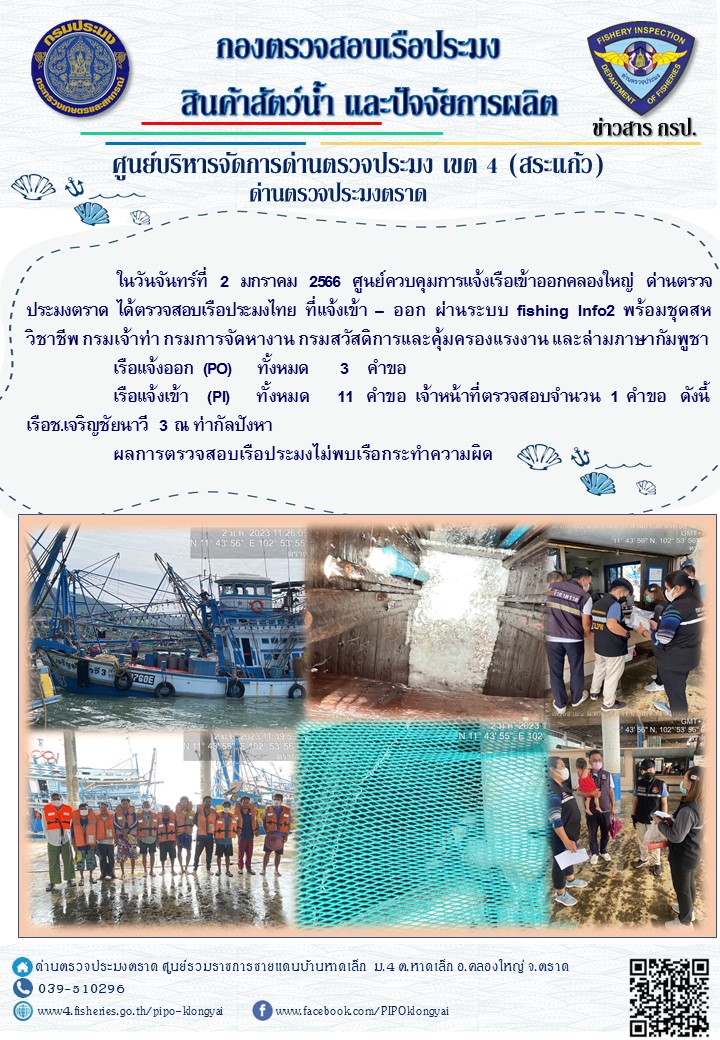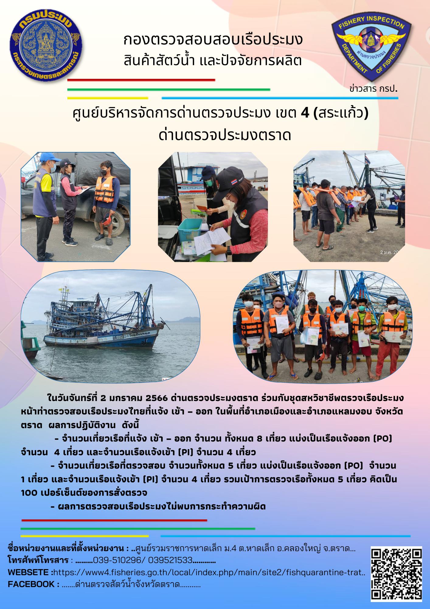 • ด่านตรวจประมงตราด เข้าร่วมกิจกรรมเก็บขยะชายหาดเฉลิมพระเกียรติ สมเด็จพระเจ้าลูกเธอ เจ้าฟ้าาสิริวัณณวรี นารีรัตนราชกัญญา เนื่องในโอกาสวันคล้ายวันประสูติ 8 มกราคม 2568 ด่านตรวจประมงตราด เข้าร่วมกิจกรรมเก็บขยะชายหาดเฉลิมพระเกียรติ สมเด็จพระเจ้าลูกเธ... จำนวนผู้อ่าน 67  ผลการปฏิบัติงานของด่านตรวจประมงตราด ประจำวันที่ 12 มิถุนายน 2568  ผลการปฏิบัติงานของด่านตรวจประมงตราด ประจำวันที่ 12 มิถุนายน 2568   จำนวนผู้อ่าน 61 ประกาศคณะกรรมการขายทอดตลาดเรือประมง สำนักงานประมงจังหวัดตราด เรื่องขายทอดตลาดเรือประมง (ของกลาง) ประกาศคณะกรรมการขายทอดตลาดเรือประมง สำนักงานประมงจังหวัดตราด เรื่องขายทอดตลาดเรื... จำนวนผู้อ่าน 59 ผลการปฏิบัติงานของด่านตรวจประมงตราด ประจำวันที่ 6 มิถุนายน 2568  ผลการปฏิบัติงานของด่านตรวจประมงตราด ประจำวันที่ 6 มิถุนายน 2568   จำนวนผู้อ่าน 52 ผลการปฏิบัติงานของด่านตรวจประมงตราด ประจำวันที่ 6 พฤษภาคม 2568  ผลการปฏิบัติงานของด่านตรวจประมงตราด ประจำวันที่ 6 พฤษภาคม 2568   จำนวนผู้อ่าน 50 รายงานการนำเข้า-ส่งออกสัตว์น้ำ ซากสัตว์น้ำและผลิตภัณฑ์สัตว์น้ำ และเรือประมงต่างประเทศที่เข้าเทียบท่าผ่านทางด่านตรวจประมงตราด ประจำเดือน มีนาคม 2568 รายงานการนำเข้า-ส่งออกสัตว์น้ำ ซากสัตว์น้ำและผลิตภัณฑ์สัตว์น้ำ และเรือประมงต่างป... จำนวนผู้อ่าน 48 ผลการปฏิบัติงานของด่านตรวจประมงตราด ประจำวันที่ 10 มิถุนายน 2568  ผลการปฏิบัติงานของด่านตรวจประมงตราด ประจำวันที่ 10 มิถุนายน 2568   จำนวนผู้อ่าน 46 ด่านตรวจประมงตราด ร่วมพิธีปล่อยพันธ์ุสัตว์น้ำ เนื่องในโอกาสวันเฉลิมพระชนมพรรษา สมเด็จพระนางเจ้าสิริกิติ์ พระบรมราชินีนาถ พระบรมราชชนนีพันปีหลวง ด่านตรวจประมงตราด ร่วมพิธีปล่อยพันธ์ุสัตว์น้ำ เนื่องในโอกาสวันเฉลิมพระชนมพรรษา ส... จำนวนผู้อ่าน 46 ผลการปฏิบัติงานของด่านตรวจประมงตราด ประจำวันที่ 27 เมษายน 2568  ผลการปฏิบัติงานของด่านตรวจประมงตราด ประจำวันที่ 27 เมษายน 2568   จำนวนผู้อ่าน 45 โครงการประมงรวมใจ จ่ายระบบติดตามเรือประมง (VMS) คนละครึ่ง โครงการประมงรวมใจ จ่ายระบบติดตามเรือประมง (VMS) คนละครึ่ง  จำนวนผู้อ่าน 45 ผลการปฏิบัติงานของด่านตรวจประมงตราด ประจำวันที่ 16 มิถุนายน 2568  ผลการปฏิบัติงานของด่านตรวจประมงตราด ประจำวันที่ 16 มิถุนายน 2568   จำนวนผู้อ่าน 44 ผลการปฏิบัติงานของด่านตรวจประมงตราด ประจำวันที่ 9 มิถุนายน 2568  ผลการปฏิบัติงานของด่านตรวจประมงตราด ประจำวันที่ 9 มิถุนายน 2568   จำนวนผู้อ่าน 34 ผลการปฏิบัติงานของด่านตรวจประมงตราด ประจำวันที่ 4 สิงหาคม 2568  ผลการปฏ