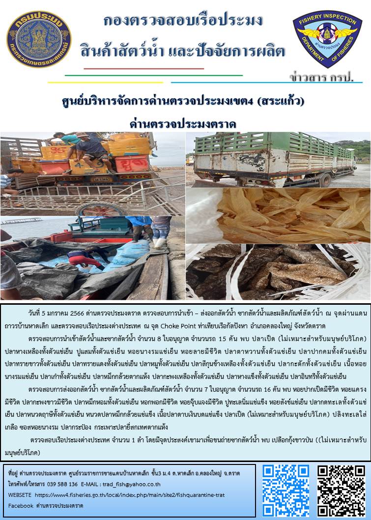 รายละเอียด 1. ส่วนงานควบคุมการนำเข้า - ส่งออกสัตว์น้ำ ซากสัตว์น้ำ และผลิตภัณฑ์สัตว์น้ำ                  สถานที่ตั้งและที่อยู่ : ศูนย์รวมราชการชายแดนบ้านหาดเล็ก ชั้น3 หมู่ 4 ตำบลหาดเล็ก อำเภอคลองใหญ่ จังหวัตราด 23110              โทรศัพท์/โทรสาร : (039)588136              E-MAIL : trad_fish@yahoo.co.th   2. ส่วนงานควบคุมการแจ้งเรือเข้าออกตราด และ ส่วนงานอำนวยการ             สถานที่ตั้งและที่อยู่ : 34 หมู่ 8 ตำบลวังกระแจะ อำเภอเมือง จังหวัดตราด 23000             โทรศัพท์/โทรสาร : (039)521533 , 096-138-0520             E-MAIL : TRAT Fishery Inspection@fisheries.go.th   3. ส่วนงานควบคุมการแจ้งเรือเข้าออกคลองใหญ่             สถานที่ตั้งและที่อยู่ : ท่าเทียบเรือกัลปังหา เลขที่ 86 ถนนเทศบาล 1 ตำบลหาดเล็ก อำเภอคลองใหญ่ จังหวัดตราด 23110             โทรศัพท์/โทรสาร : (039)510296             E-MAIL : pipoklongyai@gmail.com  email  trad_fish@yahoo.co.th  โทรศัพท์ (039)588136 , (039)521533 , (039)510296  FAX (039)588136 , (039)521533 , (039)510296  แฟนเพจ แฟนเพจ