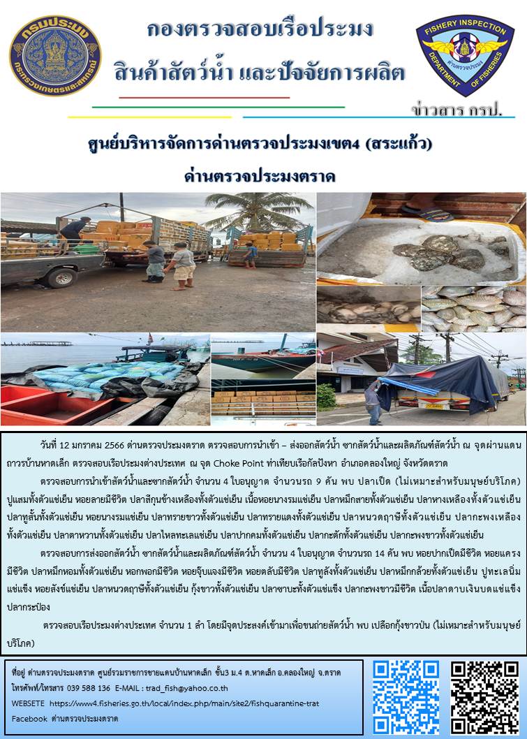 รายละเอียด 1. ส่วนงานควบคุมการนำเข้า - ส่งออกสัตว์น้ำ ซากสัตว์น้ำ และผลิตภัณฑ์สัตว์น้ำ                  สถานที่ตั้งและที่อยู่ : ศูนย์รวมราชการชายแดนบ้านหาดเล็ก ชั้น3 หมู่ 4 ตำบลหาดเล็ก อำเภอคลองใหญ่ จังหวัตราด 23110              โทรศัพท์/โทรสาร : (039)588136              E-MAIL : trad_fish@yahoo.co.th   2. ส่วนงานควบคุมการแจ้งเรือเข้าออกตราด และ ส่วนงานอำนวยการ             สถานที่ตั้งและที่อยู่ : 34 หมู่ 8 ตำบลวังกระแจะ อำเภอเมือง จังหวัดตราด 23000             โทรศัพท์/โทรสาร : (039)521533 , 096-138-0520             E-MAIL : TRAT Fishery Inspection@fisheries.go.th   3. ส่วนงานควบคุมการแจ้งเรือเข้าออกคลองใหญ่             สถานที่ตั้งและที่อยู่ : ท่าเทียบเรือกัลปังหา เลขที่ 86 ถนนเทศบาล 1 ตำบลหาดเล็ก อำเภอคลองใหญ่ จังหวัดตราด 23110             โทรศัพท์/โทรสาร : (039)510296             E-MAIL : pipoklongyai@gmail.com  email  trad_fish@yahoo.co.th  โทรศัพท์ (039)588136 , (039)521533 , (039)510296  FAX (039)588136 , (039)521533 , (039)510296  แฟนเพจ แฟนเพจ