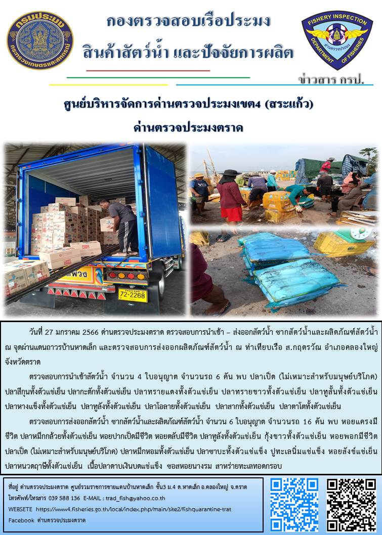 รายละเอียด 1. ส่วนงานควบคุมการนำเข้า - ส่งออกสัตว์น้ำ ซากสัตว์น้ำ และผลิตภัณฑ์สัตว์น้ำ                  สถานที่ตั้งและที่อยู่ : ศูนย์รวมราชการชายแดนบ้านหาดเล็ก ชั้น3 หมู่ 4 ตำบลหาดเล็ก อำเภอคลองใหญ่ จังหวัตราด 23110              โทรศัพท์/โทรสาร : (039)588136              E-MAIL : trad_fish@yahoo.co.th   2. ส่วนงานควบคุมการแจ้งเรือเข้าออกตราด และ ส่วนงานอำนวยการ             สถานที่ตั้งและที่อยู่ : 34 หมู่ 8 ตำบลวังกระแจะ อำเภอเมือง จังหวัดตราด 23000             โทรศัพท์/โทรสาร : (039)521533 , 096-138-0520             E-MAIL : TRAT Fishery Inspection@fisheries.go.th   3. ส่วนงานควบคุมการแจ้งเรือเข้าออกคลองใหญ่             สถานที่ตั้งและที่อยู่ : ท่าเทียบเรือกัลปังหา เลขที่ 86 ถนนเทศบาล 1 ตำบลหาดเล็ก อำเภอคลองใหญ่ จังหวัดตราด 23110             โทรศัพท์/โทรสาร : (039)510296             E-MAIL : pipoklongyai@gmail.com  email  trad_fish@yahoo.co.th  โทรศัพท์ (039)588136 , (039)521533 , (039)510296  FAX (039)588136 , (039)521533 , (039)510296  แฟนเพจ แฟนเพจ