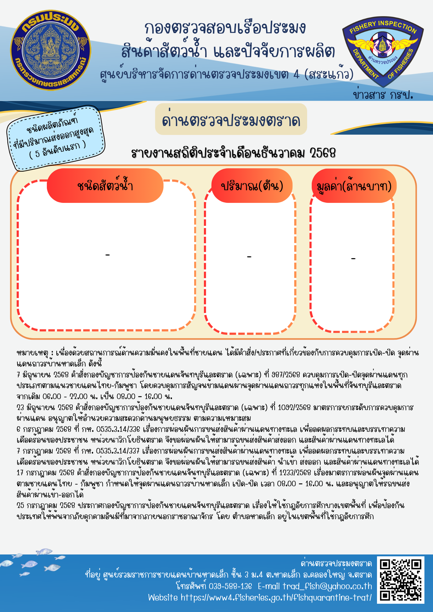 NEW รายงานการนำเข้า-ส่งออกสัตว์น้ำ ซากสัตว์น้ำและผลิตภัณฑ์สัตว์น้ำ และเรือประมงต่างประเทศที่เข้าเทียบท่าผ่านทางด่านตรวจประมงตราด ประจำเดือน ธันวาคม 2568..คลิก