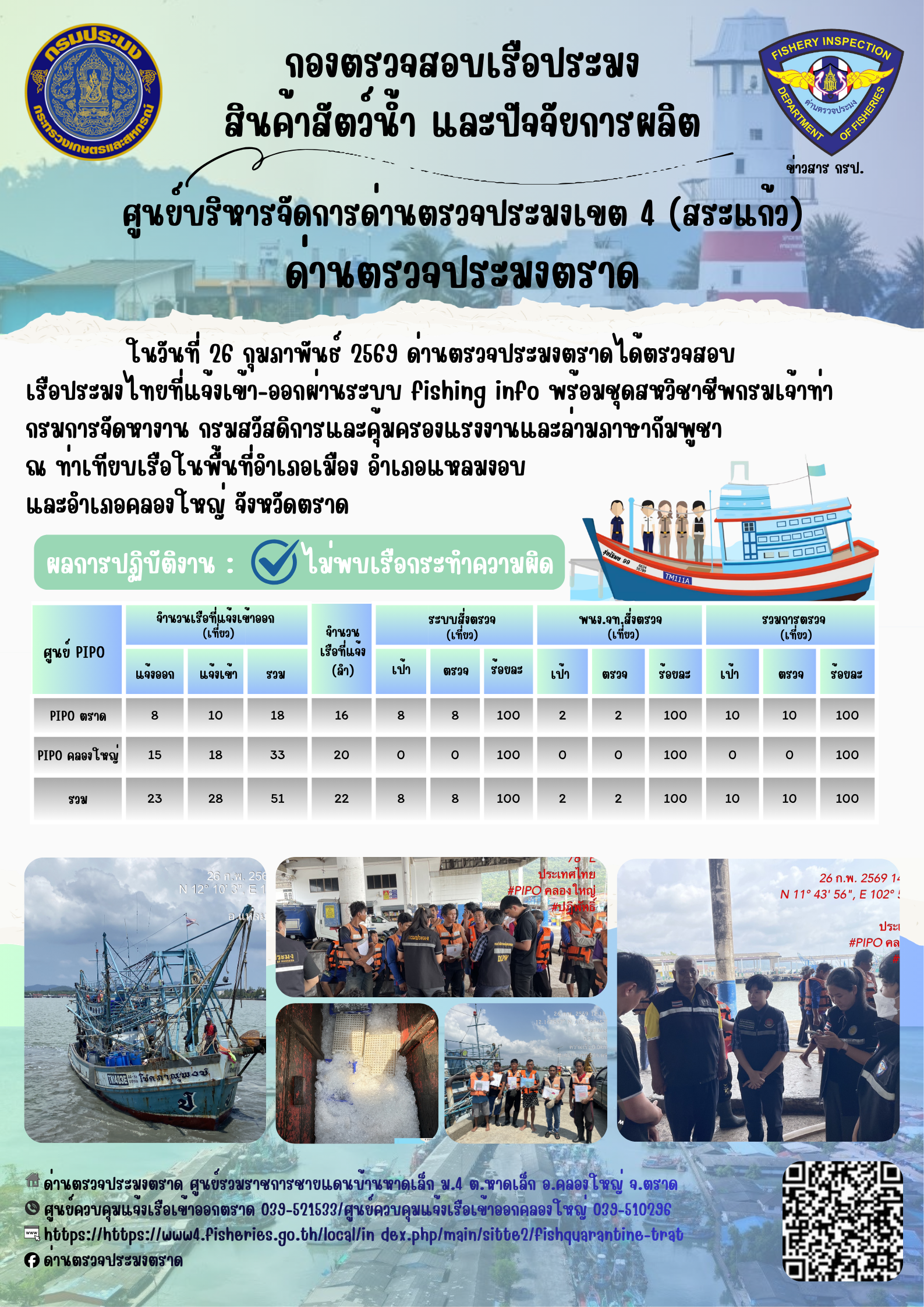 ผลการปฏิบัติงานของด่านตรวจประมงตราด ประจำวันที่ 26 กุมภาพันธ์ 2569