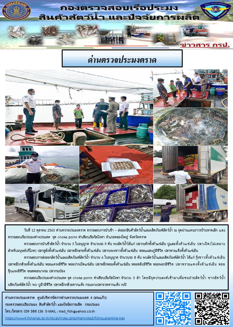 วันที่ 12 ตุลาคม 2563 ด่านตรวจประมงตราด ตรวจสอบการนำเข้า – ส่งออกสินค้าสัตว์น้ำและผลิตภัณฑ์สัตว์น้ำ ณ จุดผ่านแดนถาวรบ้านหาดเล็ก ตรวจสอบเรือประมงต่างประเทศ ร่วมกับ ศุลกากรคลองใหญ่ ตำรวจตรวจคนเข้าเมือง จุด choke point ท่าเทียบเรือกัลปังหา อำเภอคลองใหญ่ จังหวัดตราด และ ตรวจสอบเรือประมงไทย ที่แจ้งเข้า - ออกผ่านระบบ Fishing info2 ร่วมกับชุดสหวิชาชีพ กรมเจ้าท่า กรมจัดหางาน กรมสวัสดิการ และคุ้มครองแผนงาน และล่ามภาษากัมพูชา เขตพื้นที่อำเภอคลองใหญ่ พื้นที่อำเภอเมืองและอำเภอแหลมงอบ จังหวัดตราด..คลิก