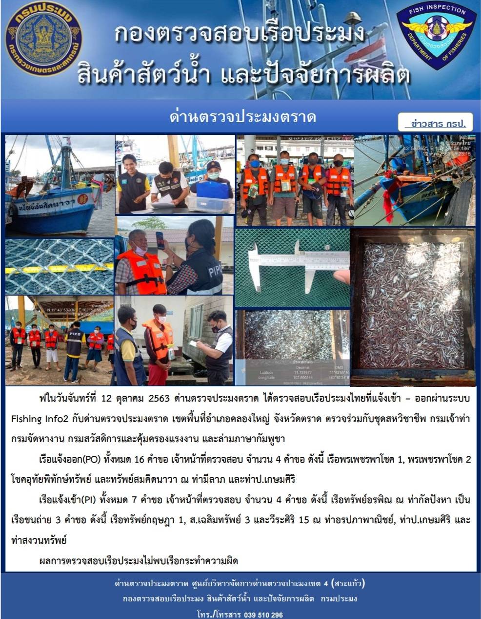 วันที่ 12 ตุลาคม 2563 ด่านตรวจประมงตราด ตรวจสอบการนำเข้า – ส่งออกสินค้าสัตว์น้ำและผลิตภัณฑ์สัตว์น้ำ ณ จุดผ่านแดนถาวรบ้านหาดเล็ก ตรวจสอบเรือประมงต่างประเทศ ร่วมกับ ศุลกากรคลองใหญ่ ตำรวจตรวจคนเข้าเมือง จุด choke point ท่าเทียบเรือกัลปังหา อำเภอคลองใหญ่ จังหวัดตราด และ ตรวจสอบเรือประมงไทย ที่แจ้งเข้า - ออกผ่านระบบ Fishing info2 ร่วมกับชุดสหวิชาชีพ กรมเจ้าท่า กรมจัดหางาน กรมสวัสดิการ และคุ้มครองแผนงาน และล่ามภาษากัมพูชา เขตพื้นที่อำเภอคลองใหญ่ พื้นที่อำเภอเมืองและอำเภอแหลมงอบ จังหวัดตราด