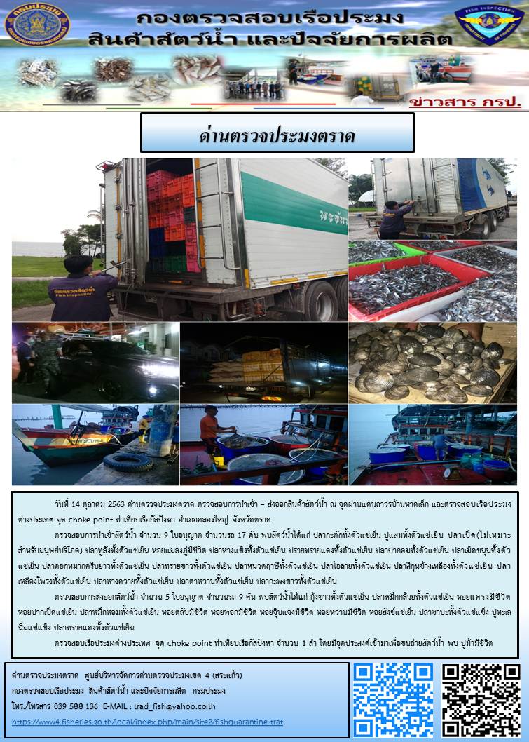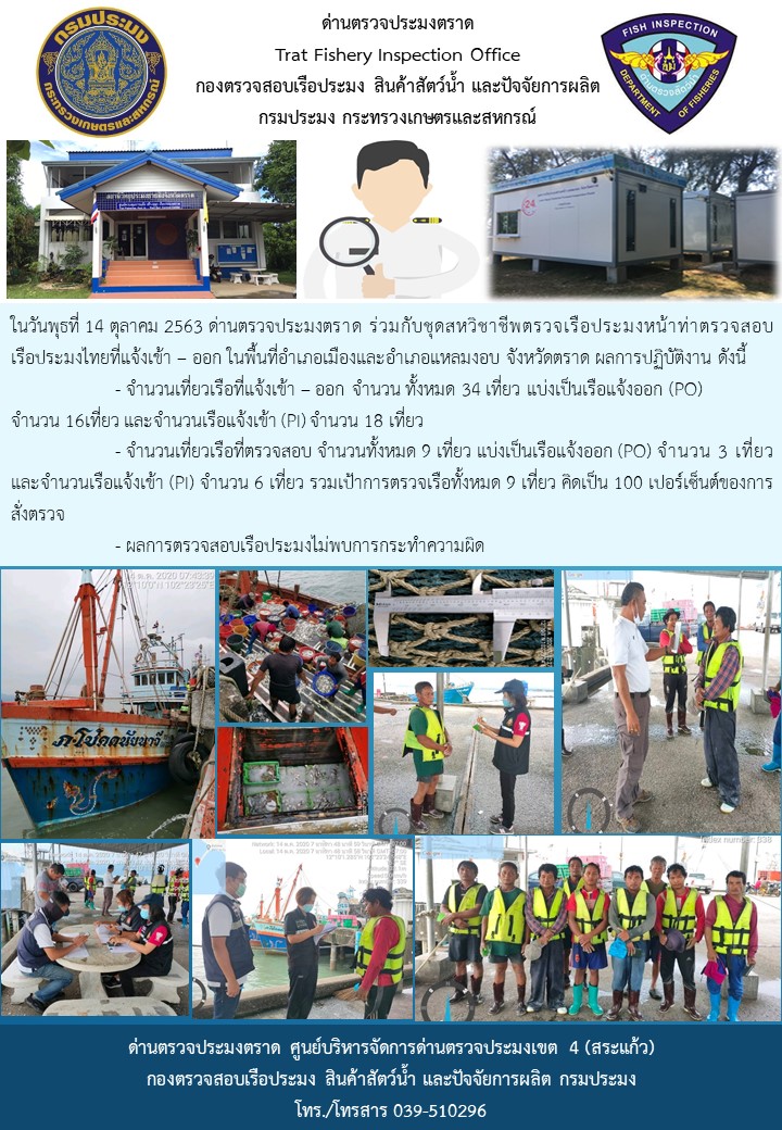 วันที่ 14 ตุลาคม 2563 ด่านตรวจประมงตราด ตรวจสอบการนำเข้า – ส่งออกสินค้าสัตว์น้ำ ณ จุดผ่านแดนถาวรบ้านหาดเล็ก ตรวจสอบเรือประมงต่างประเทศ ร่วมกับ ศุลกากรคลองใหญ่ ตำรวจตรวจคนเข้าเมือง จุด choke point ท่าเทียบเรือกัลปังหา อำเภอคลองใหญ่ จังหวัดตราด และ ตรวจสอบเรือประมงไทย ที่แจ้งเข้า - ออกผ่านระบบ Fishing info2 ร่วมกับชุดสหวิชาชีพ กรมเจ้าท่า กรมจัดหางาน กรมสวัสดิการ และคุ้มครองแผนงาน และล่ามภาษากัมพูชา เขตพื้นที่อำเภอคลองใหญ่ พื้นที่อำเภอเมืองและอำเภอแหลมงอบ จังหวัดตราด