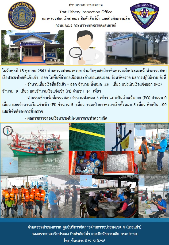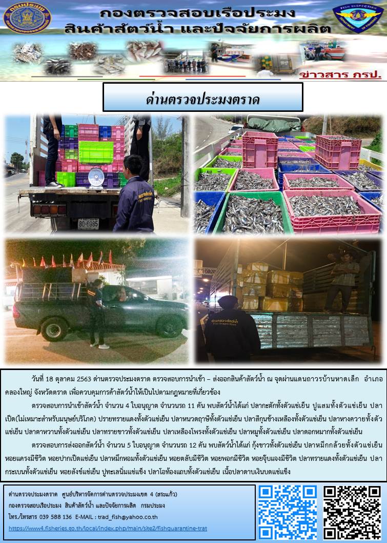วันที่ 18 ตุลาคม 2563 ด่านตรวจประมงตราด ร่วมกับหน่วยเฉพาะกิจนาวิกโยธิน 182 บ้านหาดเล็ก ตรวจสอบการนำเข้า – ส่งออกสินค้าสัตว์น้ำ ณ จุดผ่านแดนถาวรบ้านหาดเล็ก อำเภอคลองใหญ่ จังหวัดตราด และ ตรวจสอบเรือประมงไทย ที่แจ้งเข้า - ออกผ่านระบบ Fishing info2 ร่วมกับชุดสหวิชาชีพ กรมเจ้าท่า กรมจัดหางาน กรมสวัสดิการ และคุ้มครองแผนงาน และล่ามภาษากัมพูชา เขตพื้นที่อำเภอคลองใหญ่ พื้นที่อำเภอเมืองและอำเภอแหลมงอบ จังหวัดตราด
