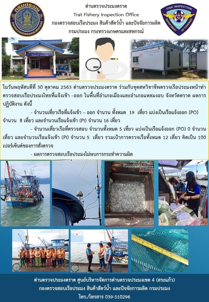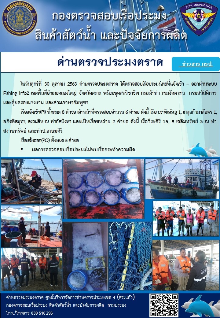วันที่ 30 ตุลาคม 2563 ด่านตรวจประมงตราด ตรวจสอบการนำเข้า – ส่งออกสินค้าสัตว์น้ำ ณ จุดผ่านแดนถาวรบ้านหาดเล็ก ตรวจสอบเรือประมงต่างประเทศ จุด choke point ท่าเทียบเรือกัลปังหา อำเภอคลองใหญ่ จังหวัดตราด และ ตรวจสอบเรือประมงไทย ที่แจ้งเข้า - ออกผ่านระบบ Fishing info2 ร่วมกับชุดสหวิชาชีพ กรมเจ้าท่า กรมจัดหางาน กรมสวัสดิการ และคุ้มครองแผนงาน และล่ามภาษากัมพูชา เขตพื้นที่อำเภอคลองใหญ่ พื้นที่อำเภอเมืองและอำเภอแหลมงอบ จังหวัดตราด