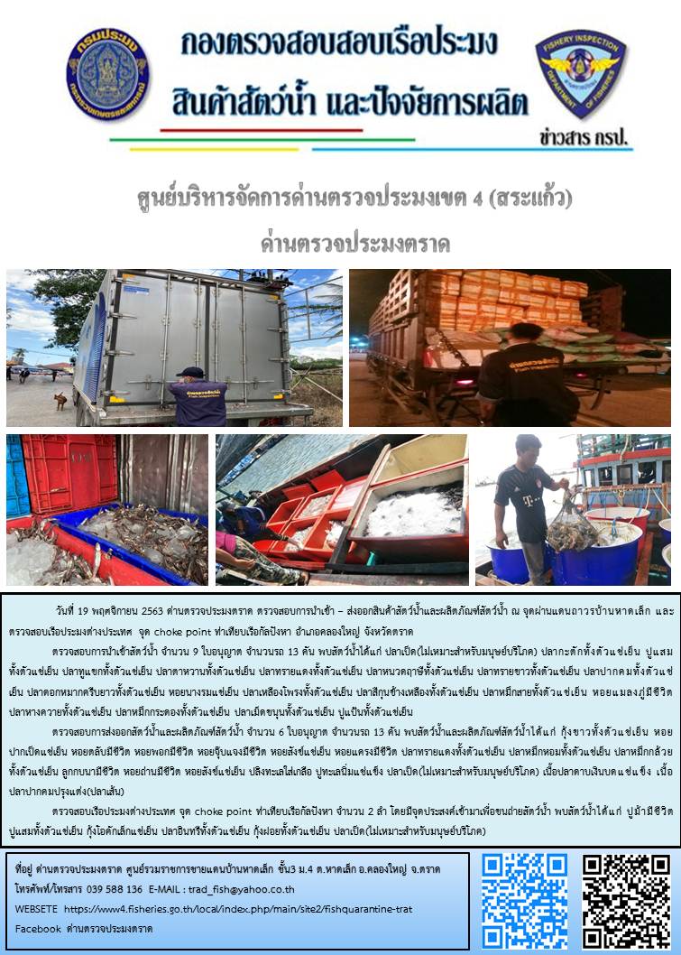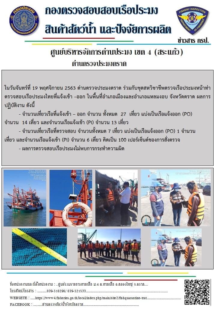 วันที่ 19 พฤศจิกายน 2563 ด่านตรวจประมงตราด ตรวจสอบการนำเข้า – ส่งออกสินค้าสัตว์น้ำและผลิตภัณฑ์สัตว์น้ำ ณ จุดผ่านแดนถาวรบ้านหาดเล็ก และตรวจสอบเรือประมงต่างประเทศ จุด choke point ท่าเทียบเรือกัลปังหา อำเภอคลองใหญ่ จังหวัดตราด และ ตรวจสอบเรือประมงไทย ที่แจ้งเข้า - ออกผ่านระบบ Fishing info2 ร่วมกับชุดสหวิชาชีพ กรมเจ้าท่า กรมจัดหางาน กรมสวัสดิการ และคุ้มครองแผนงาน และล่ามภาษากัมพูชา เขตพื้นที่อำเภอคลองใหญ่ พื้นที่อำเภอเมืองและอำเภอแหลมงอบ จังหวัดตราด