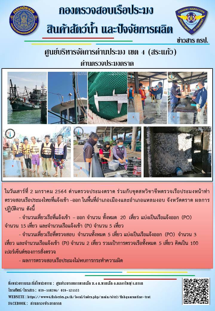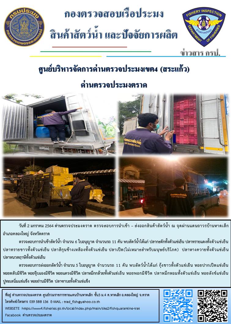 วันที่ 2 มกราคม 2564 ด่านตรวจประมงตราด  ตรวจสอบการนำเข้า – ส่งออกสินค้าสัตว์น้ำ ณ จุดผ่านแดนถาวรบ้านหาดเล็ก  อำเภอคลองใหญ่ จังหวัดตราด และ ตรวจสอบเรือประมงไทย ที่แจ้งเข้า - ออกผ่านระบบ Fishing info2 ร่วมกับชุดสหวิชาชีพ กรมเจ้าท่า กรมจัดหางาน กรมสวัสดิการ และคุ้มครองแผนงาน และล่ามภาษากัมพูชา เขตพื้นที่อำเภอคลองใหญ่ อำเภอเมืองและอำเภอแหลมงอบ จังหวัดตราด..คลิก