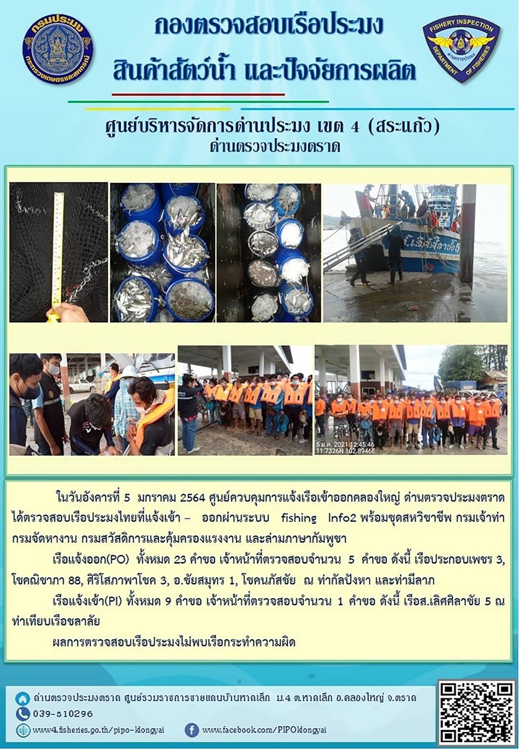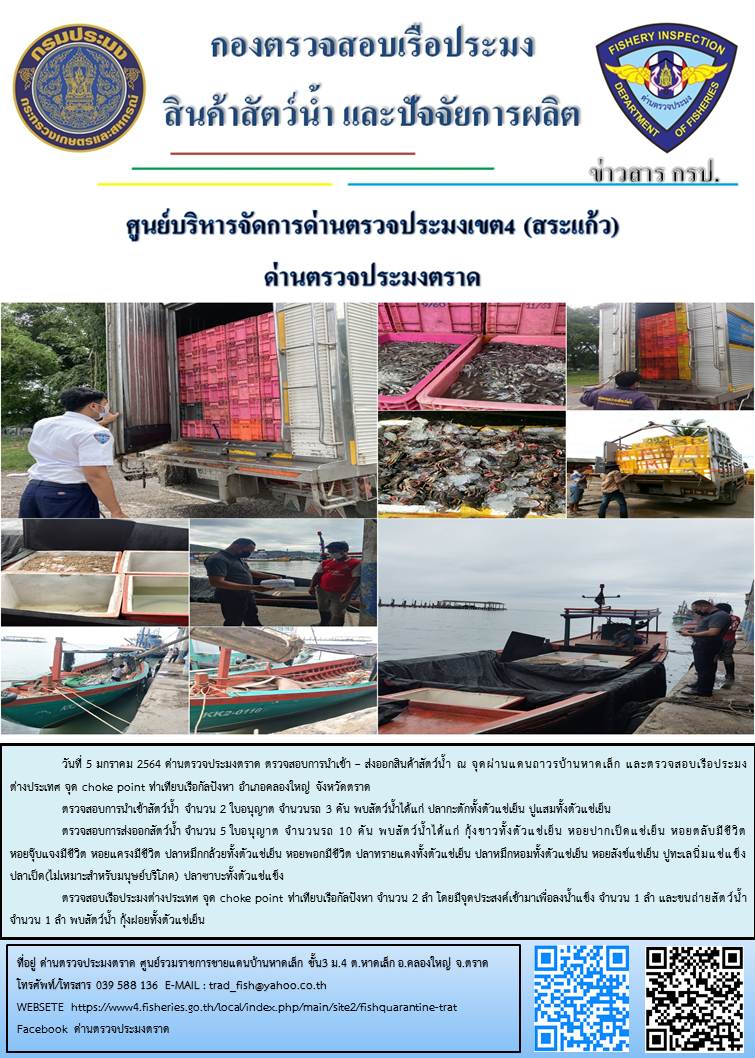 วันที่ 5 มกราคม 2564 ด่านตรวจประมงตราด  ตรวจสอบการนำเข้า – ส่งออกสินค้าสัตว์น้ำ ณ จุดผ่านแดนถาวรบ้านหาดเล็ก  อำเภอคลองใหญ่ จังหวัดตราด และ ตรวจสอบเรือประมงไทย ที่แจ้งเข้า - ออกผ่านระบบ Fishing info2 ร่วมกับชุดสหวิชาชีพ กรมเจ้าท่า กรมจัดหางาน กรมสวัสดิการ และคุ้มครองแผนงาน และล่ามภาษากัมพูชา เขตพื้นที่อำเภอคลองใหญ่ อำเภอเมืองและอำเภอแหลมงอบ จังหวัดตราด..คลิก
