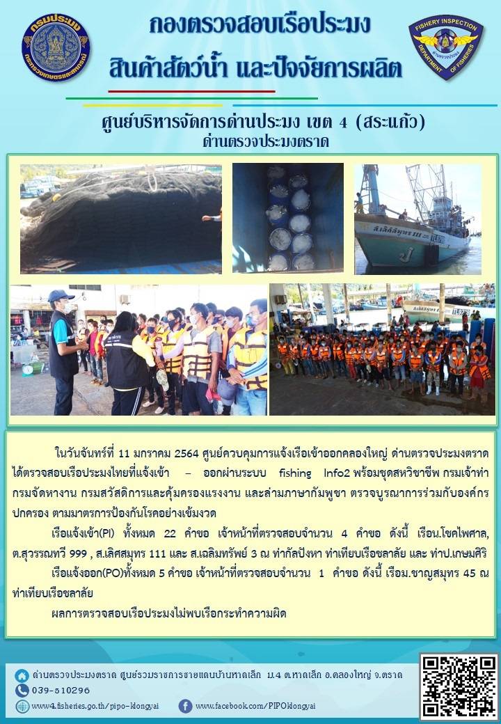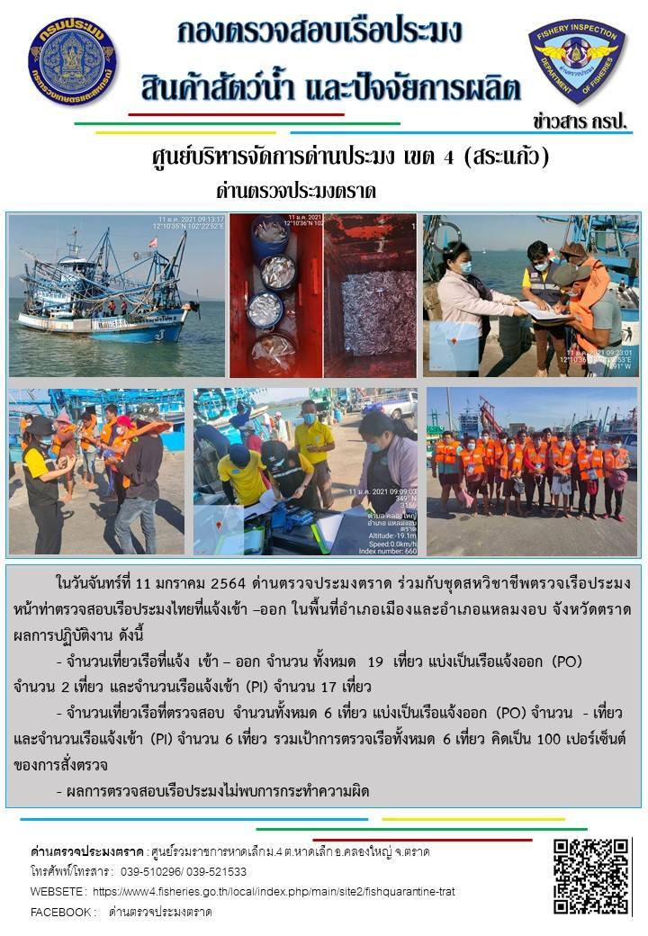 วันที่ 11 มกราคม 2563 ด่านตรวจประมงตราด  ตรวจสอบการนำเข้า – ส่งออกสินค้าสัตว์น้ำ พร้อมทั้งสุ่มเก็บตัวอย่างสัตว์น้ำเพื่อส่งตรวจวิเคราะห์ทางเคมี ณ จุดผ่านแดนถาวรบ้านหาดเล็ก  อำเภอคลองใหญ่ จังหวัดตราด และ ตรวจสอบเรือประมงไทย ที่แจ้งเข้า - ออกผ่านระบบ Fishing info2 ร่วมกับชุดสหวิชาชีพ กรมเจ้าท่า กรมจัดหางาน กรมสวัสดิการ และคุ้มครองแผนงาน และล่ามภาษากัมพูชา เขตพื้นที่อำเภอคลองใหญ่ อำเภอเมืองและอำเภอแหลมงอบ จังหวัดตราด..คลิก