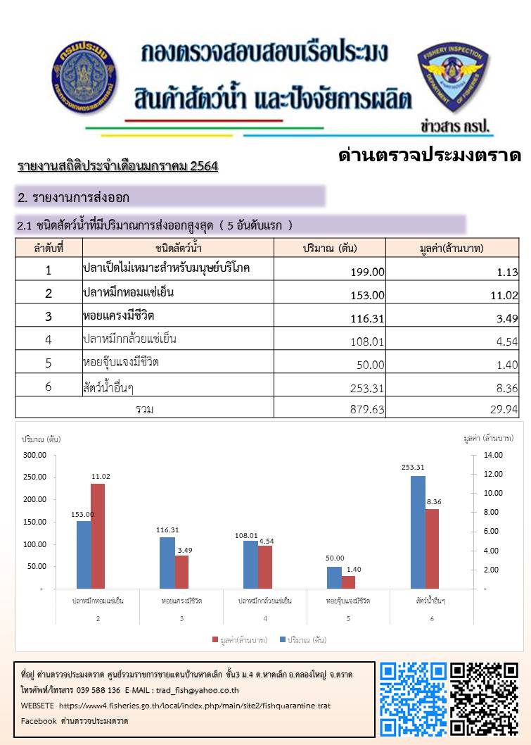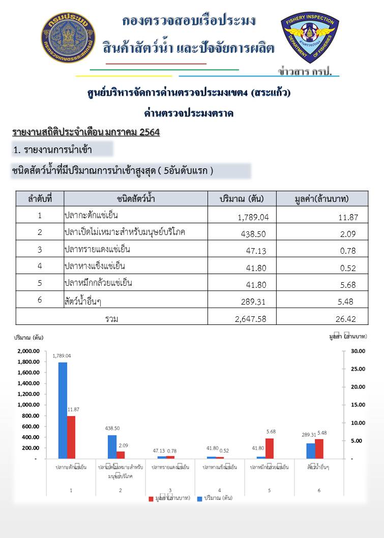 รายงานชนิดและปริมาณการนำเข้า - ส่งออกสัตว์น้ำและผลิตภัณฑ์สัตว์น้ำ และจำนวนเรือประมงต่างประเทศ จำนวนครั้งที่เข้าเทียบท่าผ่านทางด่านตรวจประมงตราด ประจำเดือน มกราคม 2564..คลิก