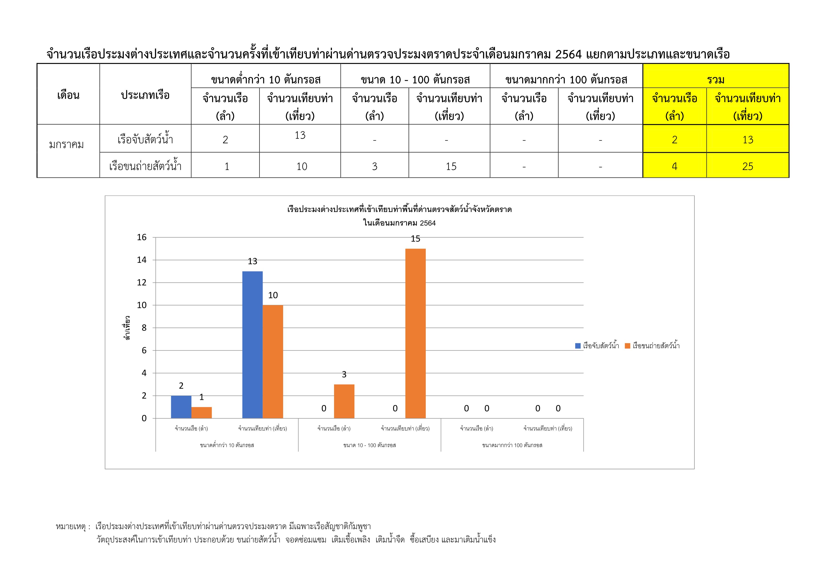 รายงานชนิดและปริมาณการนำเข้า - ส่งออกสัตว์น้ำและผลิตภัณฑ์สัตว์น้ำ และจำนวนเรือประมงต่างประเทศ จำนวนครั้งที่เข้าเทียบท่าผ่านทางด่านตรวจประมงตราด ประจำเดือน มกราคม 2564