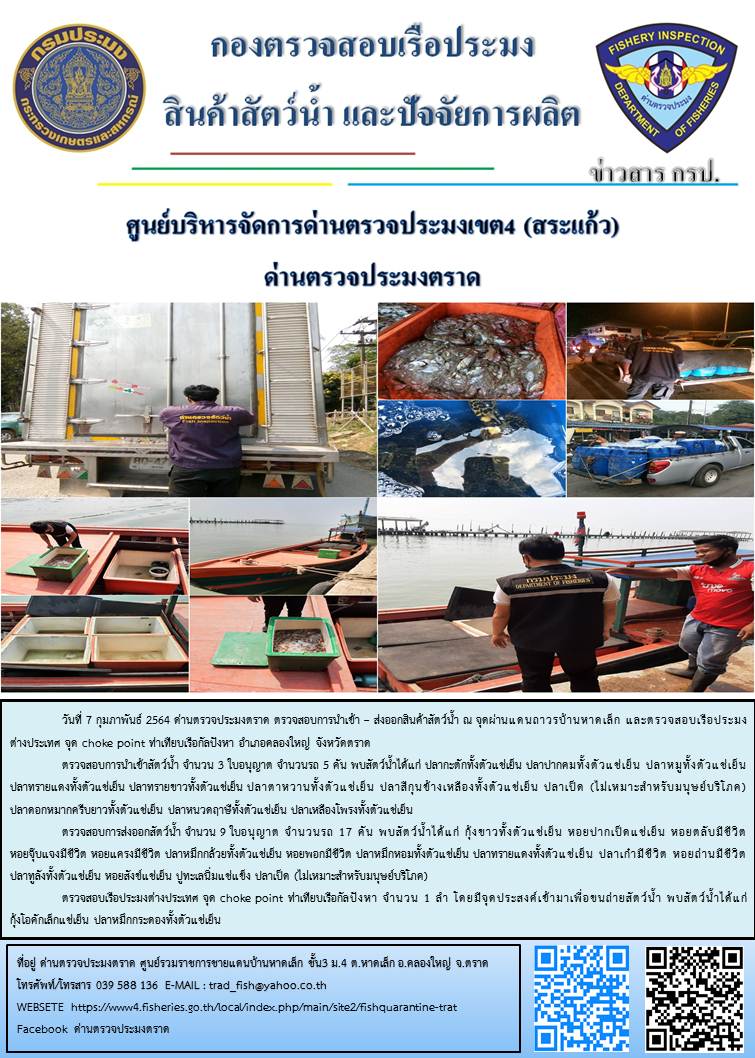 วันที่ 7 กุมภาพันธ์ 2564 ด่านตรวจประมงตราด ตรวจสอบการนำเข้า – ส่งออกสินค้าสัตว์น้ำ ณ จุดผ่านแดนถาวรบ้านหาดเล็ก ตรวจสอบเรือประมงต่างประเทศ จุด choke point ท่าเทียบเรือกัลปังหา อำเภอคลองใหญ่ จังหวัดตราด และ ตรวจสอบเรือประมงไทย ที่แจ้งเข้า - ออกผ่านระบบ Fishing info2 ร่วมกับชุดสหวิชาชีพ กรมเจ้าท่า กรมจัดหางาน กรมสวัสดิการ และคุ้มครองแผนงาน และล่ามภาษากัมพูชา เขตพื้นที่อำเภอคลองใหญ่ อำเภอเมืองและอำเภอแหลมงอบ จังหวัดตราด..คลิก