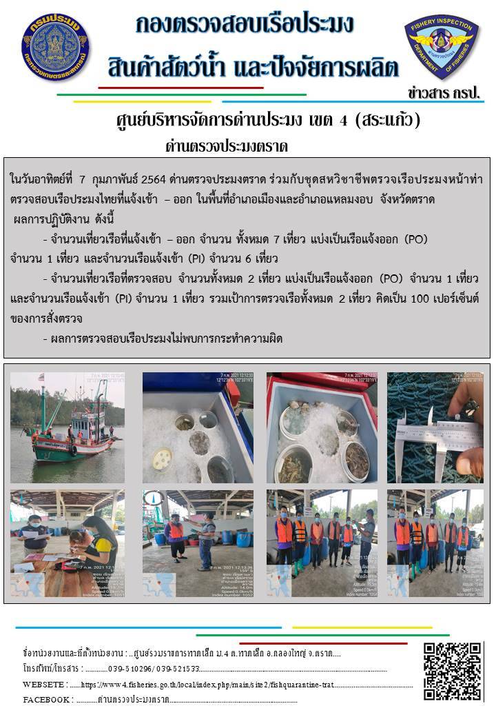วันที่ 7 กุมภาพันธ์ 2564 ด่านตรวจประมงตราด ตรวจสอบการนำเข้า – ส่งออกสินค้าสัตว์น้ำ ณ จุดผ่านแดนถาวรบ้านหาดเล็ก ตรวจสอบเรือประมงต่างประเทศ จุด choke point ท่าเทียบเรือกัลปังหา อำเภอคลองใหญ่ จังหวัดตราด และ ตรวจสอบเรือประมงไทย ที่แจ้งเข้า - ออกผ่านระบบ Fishing info2 ร่วมกับชุดสหวิชาชีพ กรมเจ้าท่า กรมจัดหางาน กรมสวัสดิการ และคุ้มครองแผนงาน และล่ามภาษากัมพูชา เขตพื้นที่อำเภอคลองใหญ่ อำเภอเมืองและอำเภอแหลมงอบ จังหวัดตราด