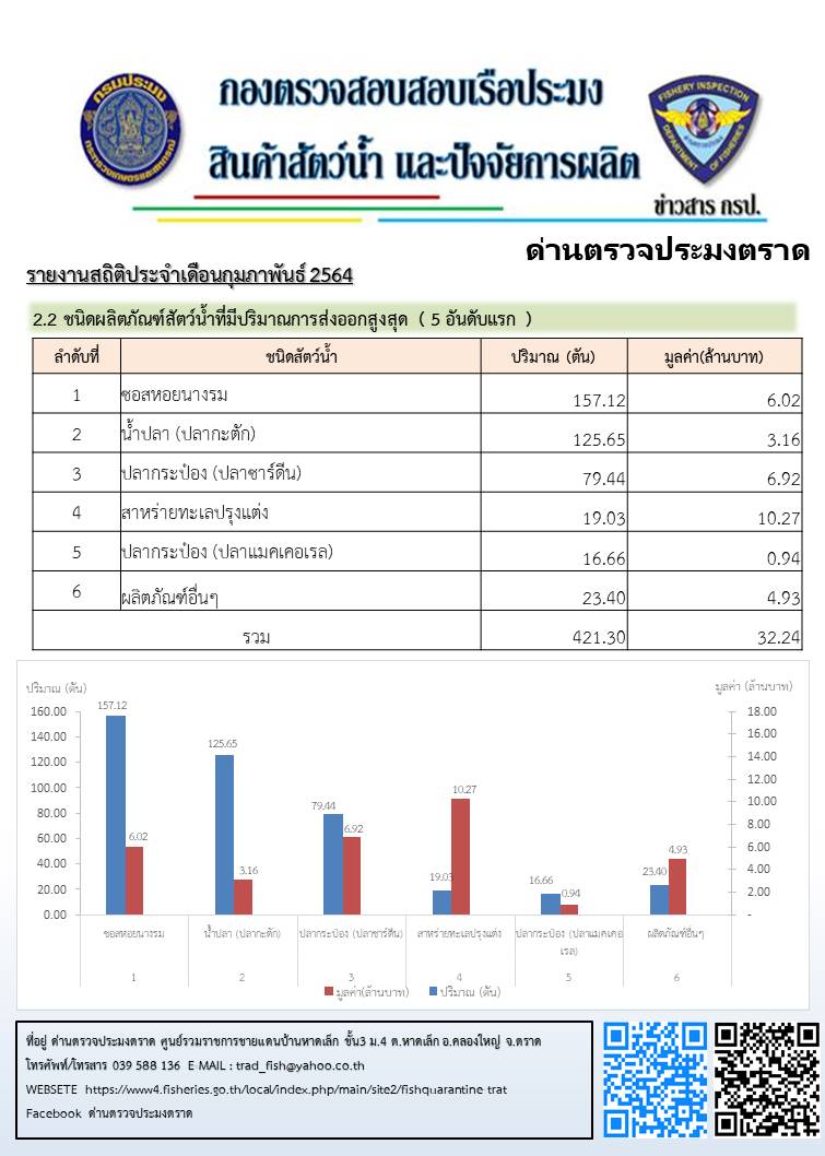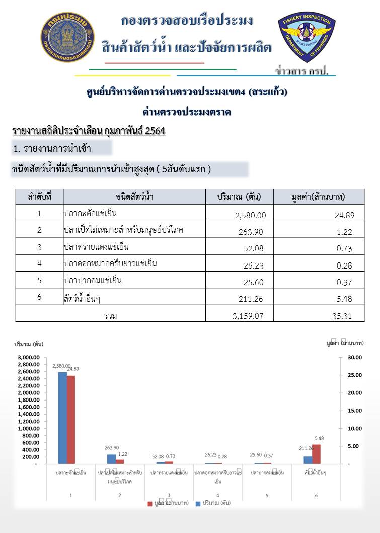 รายงานการนำเข้า - ส่งออกสินค้าสัตว์น้ำและผลิตภัณฑ์สัตว์น้ำ และ จำนวนเรือประมงต่างประเทศที่เข้าเทียบท่า ประจำเดือน กุมภาพันธ์ 2564..คลิก