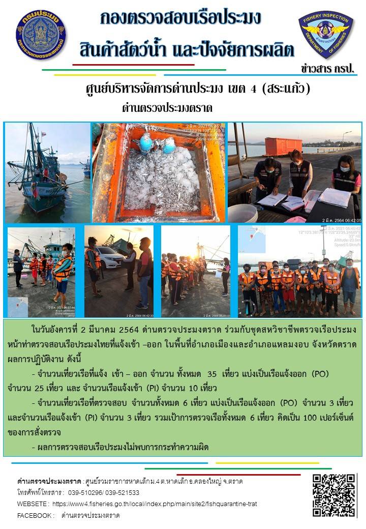 วันที่ 2 มีนาคม 2564 ด่านตรวจประมงตราด ร่วมกับหน่วยเฉพาะกิจนาวิกโยธิน 182 บ้านหาดเล็ก ตรวจสอบการนำเข้า – ส่งออกสินค้าสัตว์น้ำ ณ จุดผ่านแดนถาวรบ้านหาดเล็ก อำเภอคลองใหญ่ จังหวัดตราด และ ตรวจสอบเรือประมงไทย ที่แจ้งเข้า - ออกผ่านระบบ Fishing info2 ร่วมกับชุดสหวิชาชีพ เขตพื้นที่อำเภอเมืองและอำเภอแหลมงอบ จังหวัดตราด..คลิก