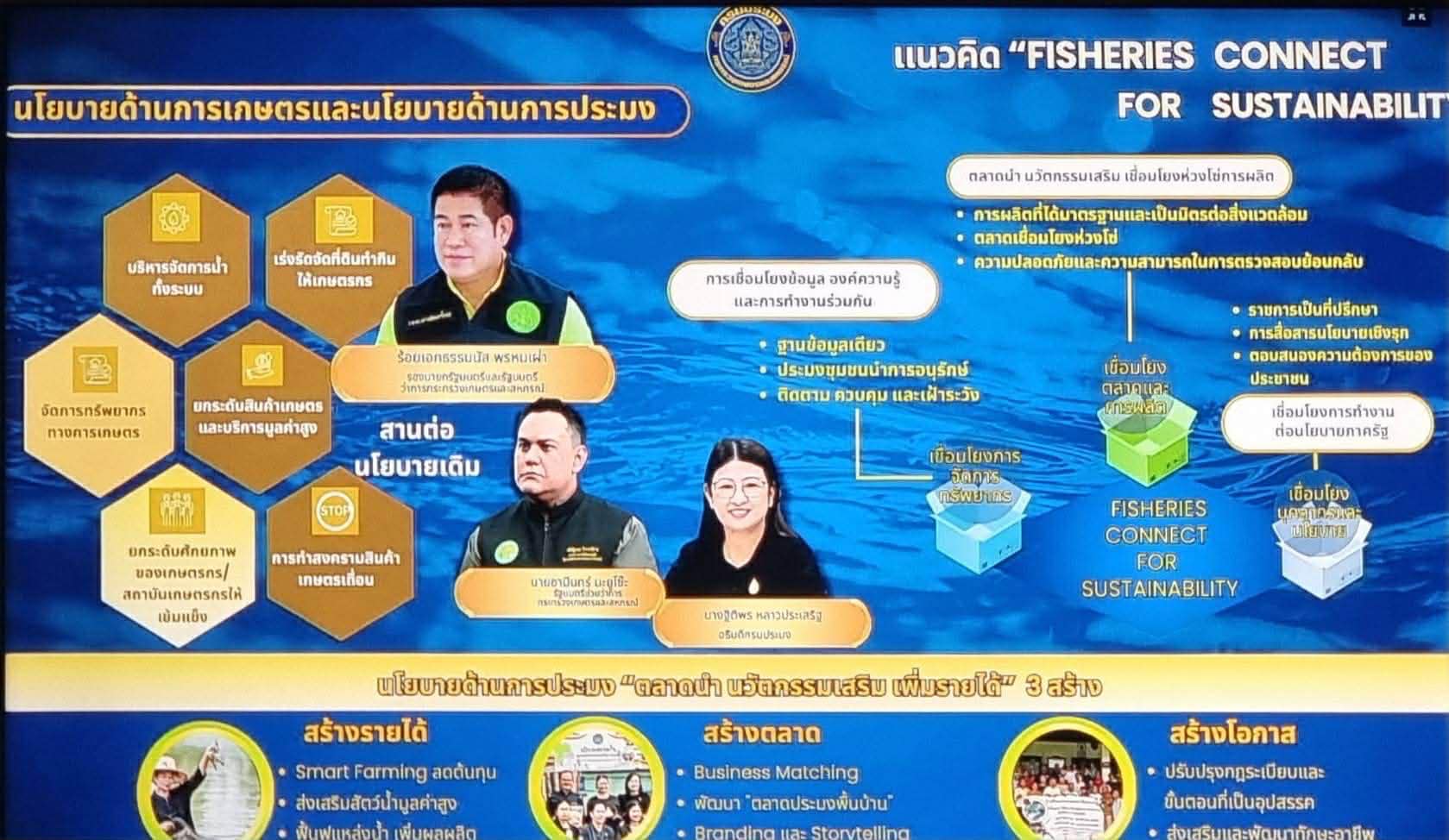 1. สร้างความร่วมมือด้านการประมงกับทุกภาคส่วน โดยเชื่อมโยงความร่วมมือระหว่างภาครัฐ หน่วยงานส่วนท้องถิ่น เกษตรกร ชาวประมง ภาคเอกชนและอุตสาหกรรมเกี่ยวเนื่อง ภาควิชาการ สถาบันการศึกษา และภาคประชาสังคม รวมถึงความร่วมมือระดับนานาชาติ เพื่อขับเคลื่อนภาคการประมงไทยสู่ความยั่งยืนอย่างเป็นรูปธรรม