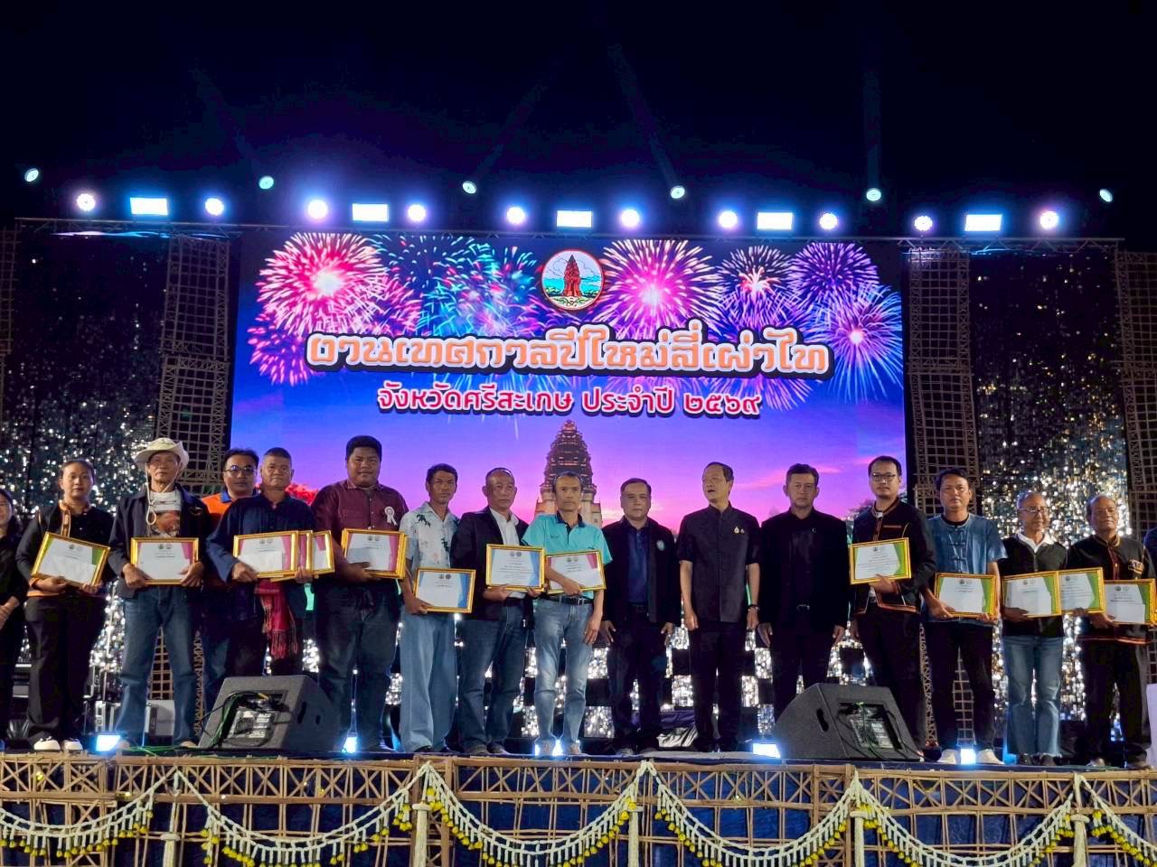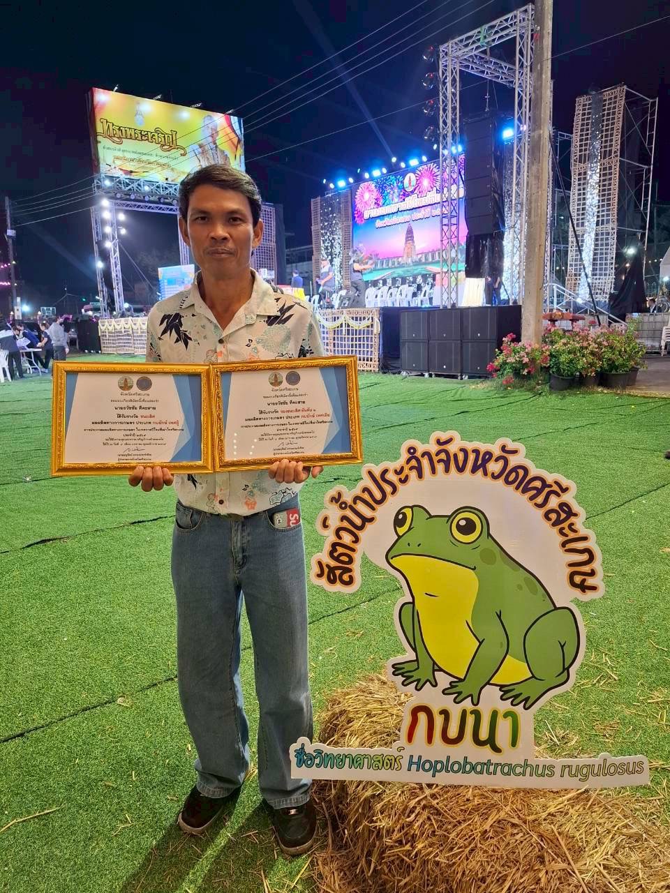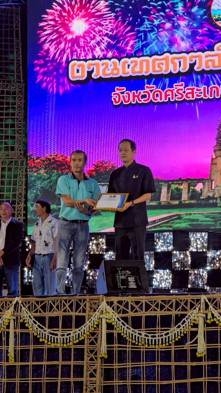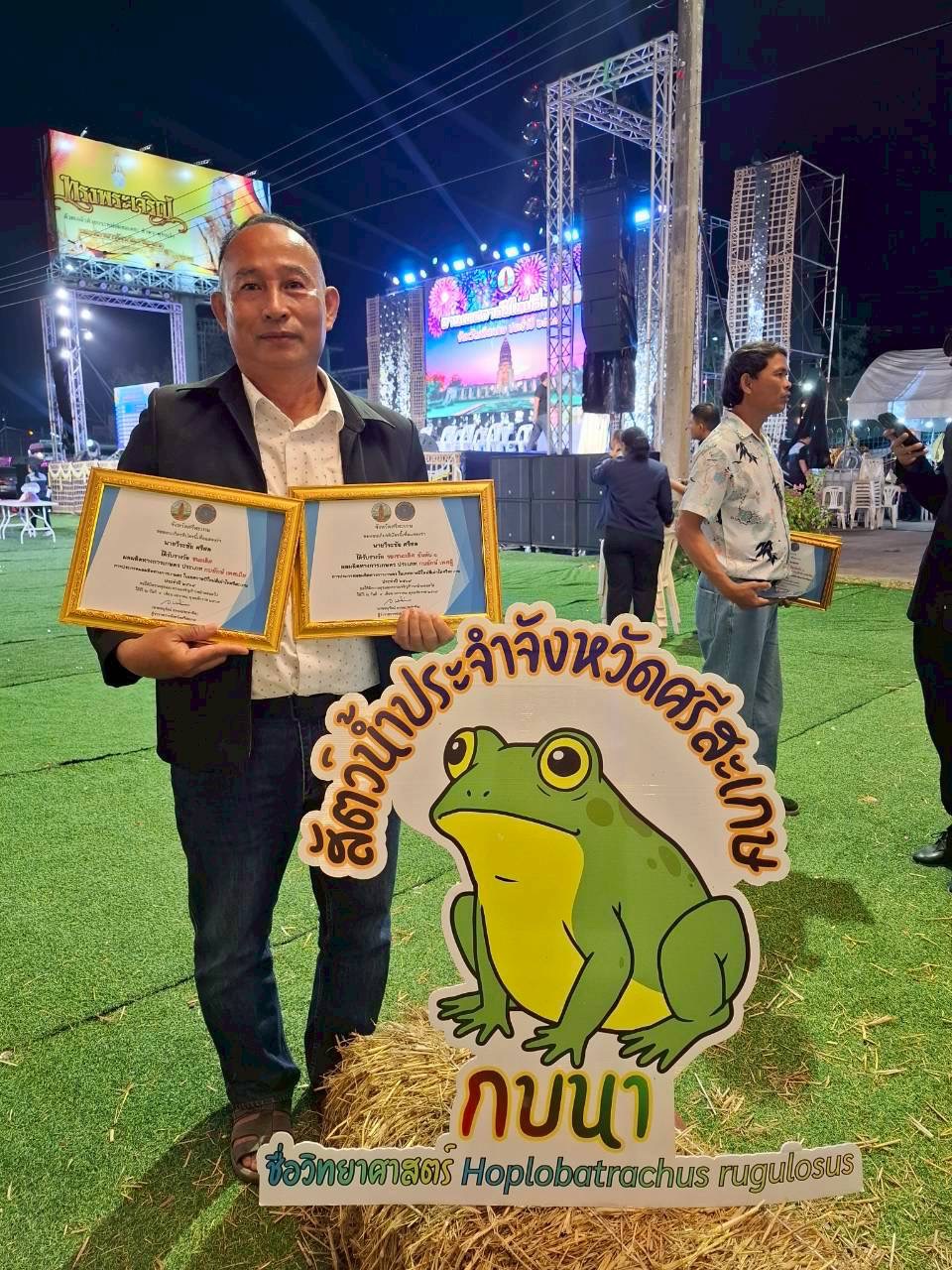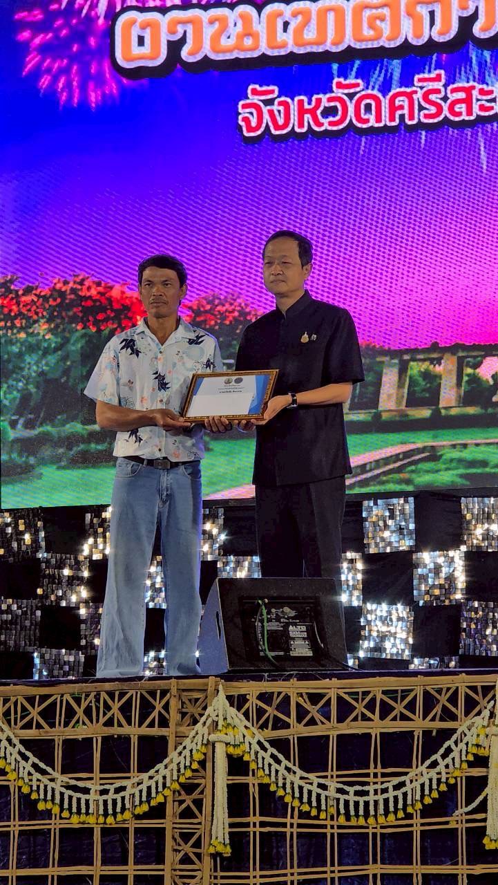 นายอิสระ สุวิทยาภรณ์ ประมงจังหวัดศรีสะเกษ พร้อมด้วยนายอาคม มุขมณีย์ ประมงอำเภอกันทรารมย์ และเจ้าหน้าที่สำนักงานฯ นำเกษตรกรเข้ารับเกียรติบัตรและเงินรางวัลการประกวดผลผลิตทางการเกษตร ในงานเทศกาลปีใหม่สี่เผ่าไทศรีสะเกษ ประจำปี 2569 จำนวน 2 รายการ ได้แก่ กบยักษ์เพศเมีย และกบยักษ์เพศผู้ โดยมีนายอนุรัตน์ ธรรมประจำจิต ผู้ว่าราชการจังหวัดศรีสะเกษ เป็นประธานในพิธีมอบรางวัล ณ เวทีกลางฯ สนามหน้าศาลากลางจังหวัดศรีสะเกษ