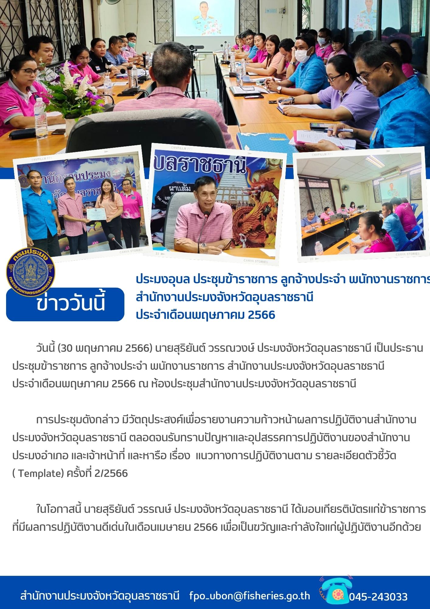 ประมงอุบล ประชุมข้าราชการ  ลูกจ้างประจำ พนักงานราชการ สำนักงานประมงจังหวัดอุบลราชธานี ประจำเดือนพฤษภาคม 2566..คลิก