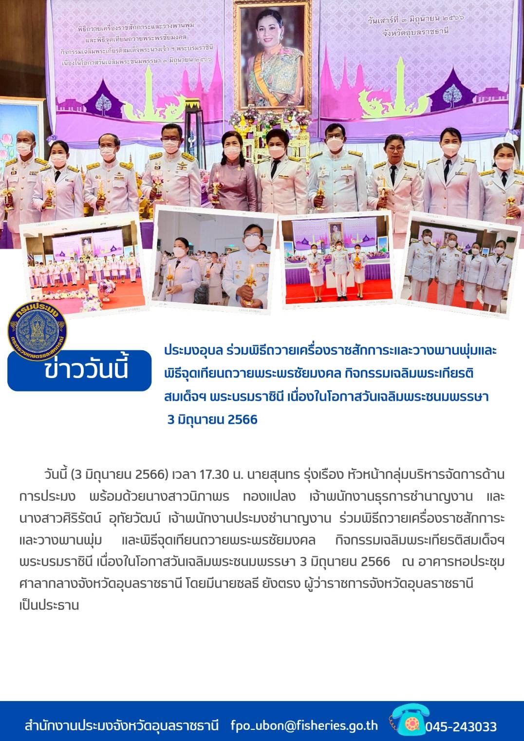 ประมงอุบล ร่วมพิธีถวายเครื่องราชสักการะและวางพานพุ่มและพิธีจุดเทียนถวายพระพรชัยมงคล กิจกรรมเฉลิมพระเกียรติสมเด็จฯ พระบรมราชินี เนื่องในโอกาสวันเฉลิมพระชนมพรรษา 3 มิถุนายน 2566