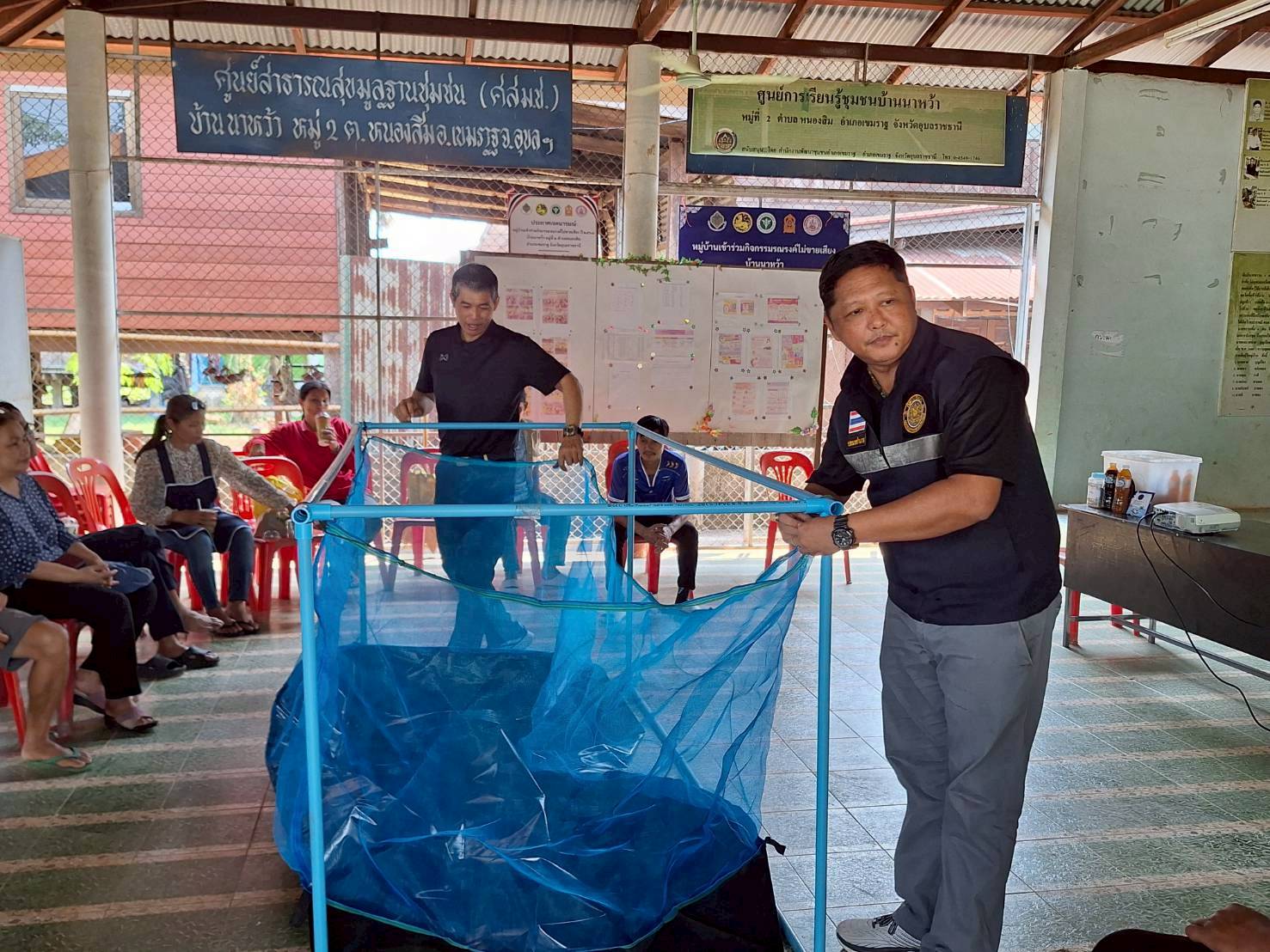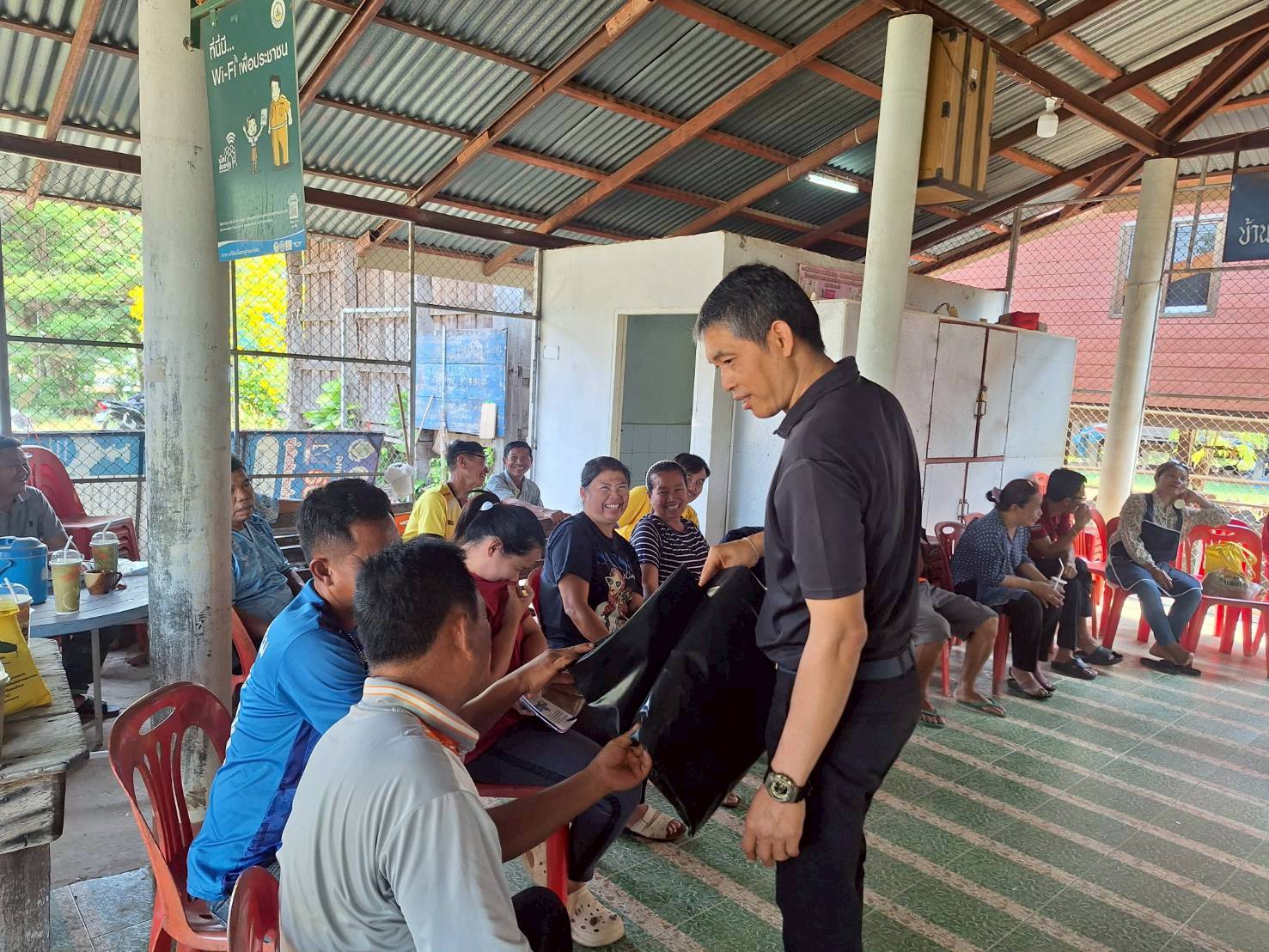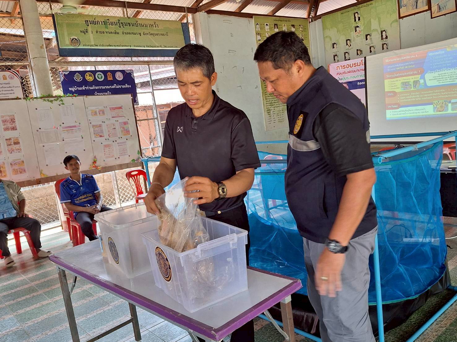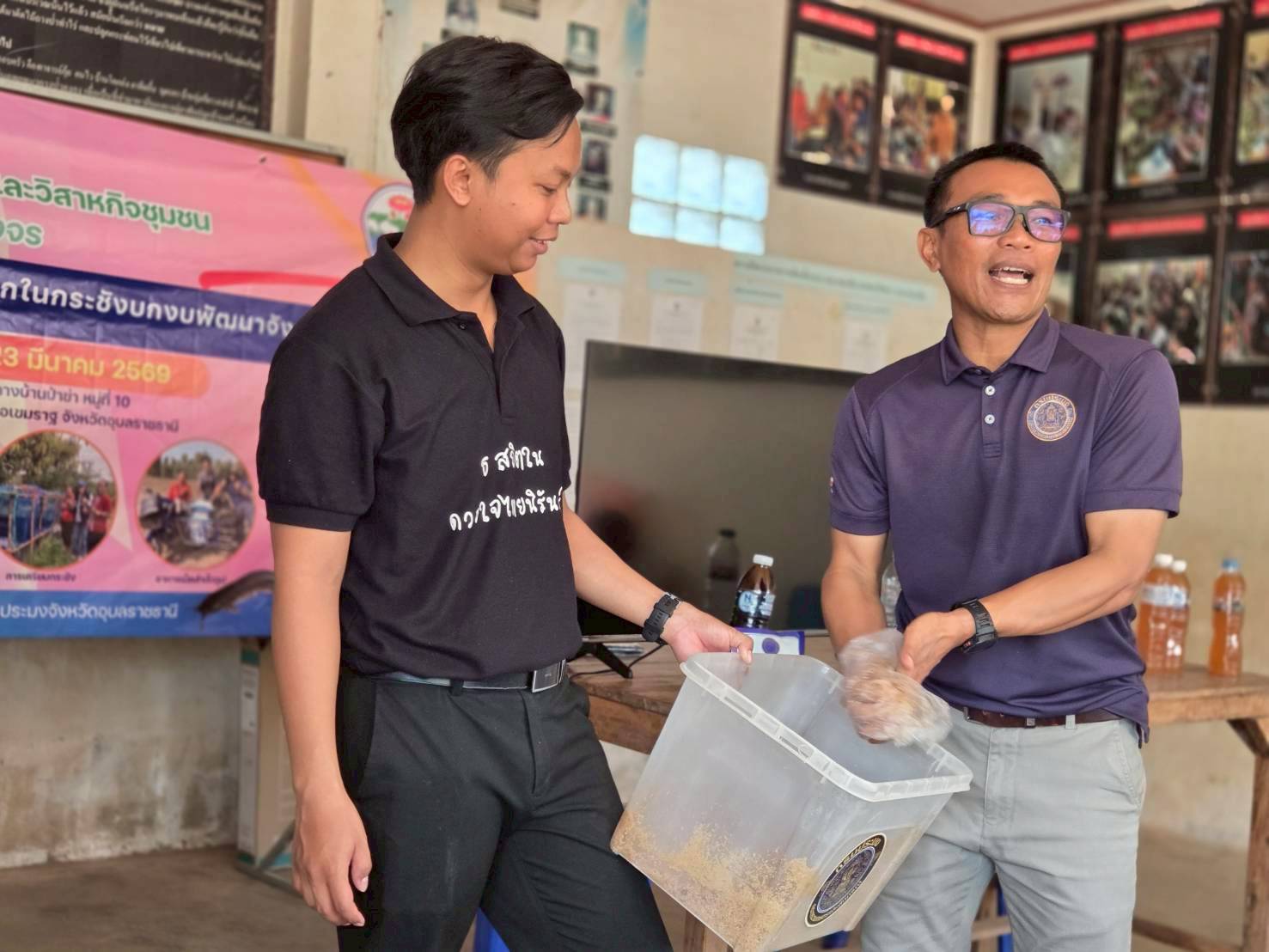 ในครั้งนี้ มีการให้คาวมรู้เบื้องต้นการเลี้ยงปลาดุกในกระชังบก  การเตรียมพื้นที่เลี้ยง การทำอาหารลดต้นทุนจากวัตถุดิบทางการเกษตร (รำ หยวกกล้วย) เพื่อให้เกษตรกรมีแหล่งอาหารโปรตีนไว้บริโภคในครัวเรือนและนำความรู้ไปต่อยอดในการประกอบอาชีพและเพิ่มรายได้ที่ยั่งยืน