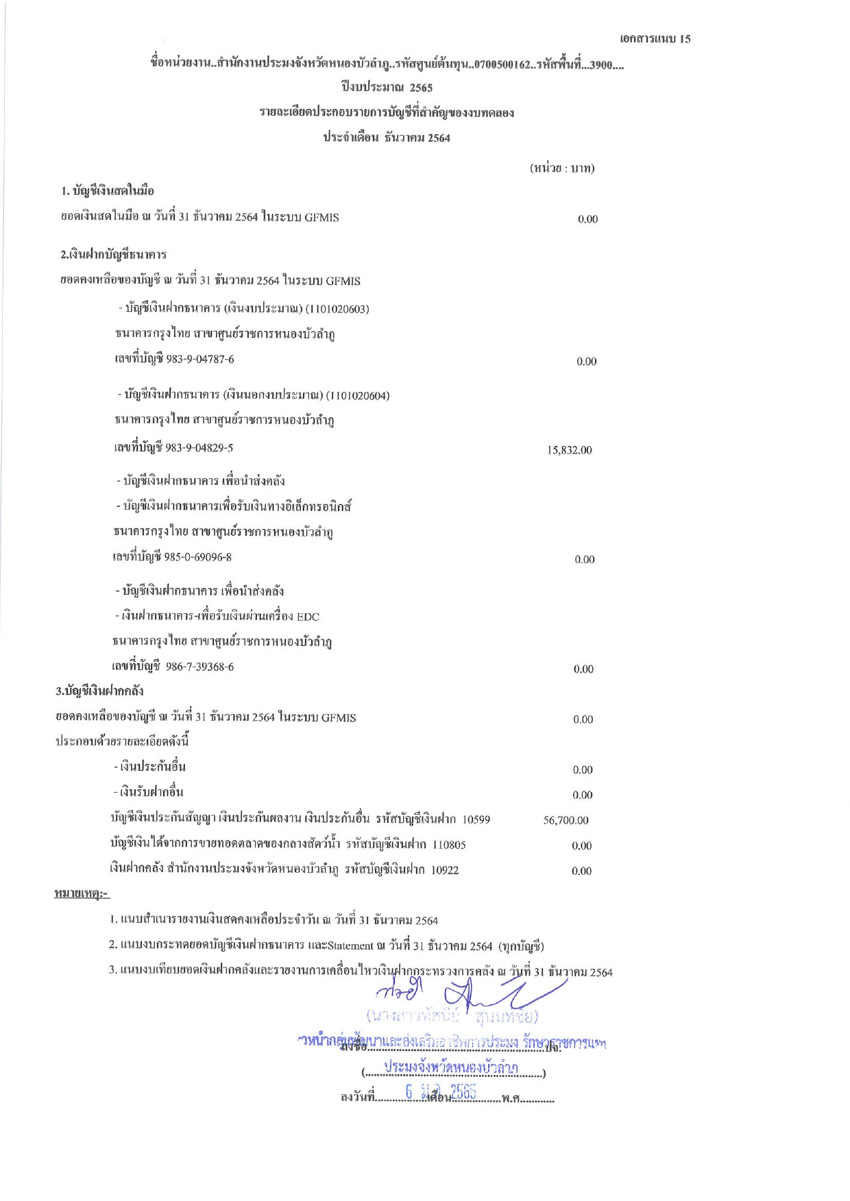 การเปิดเผยแสดงรายละเอียดประกอบรายการบัญชีที่สำคัญประกอบงบทดลองประจำเดือน ธันวาคม 2564