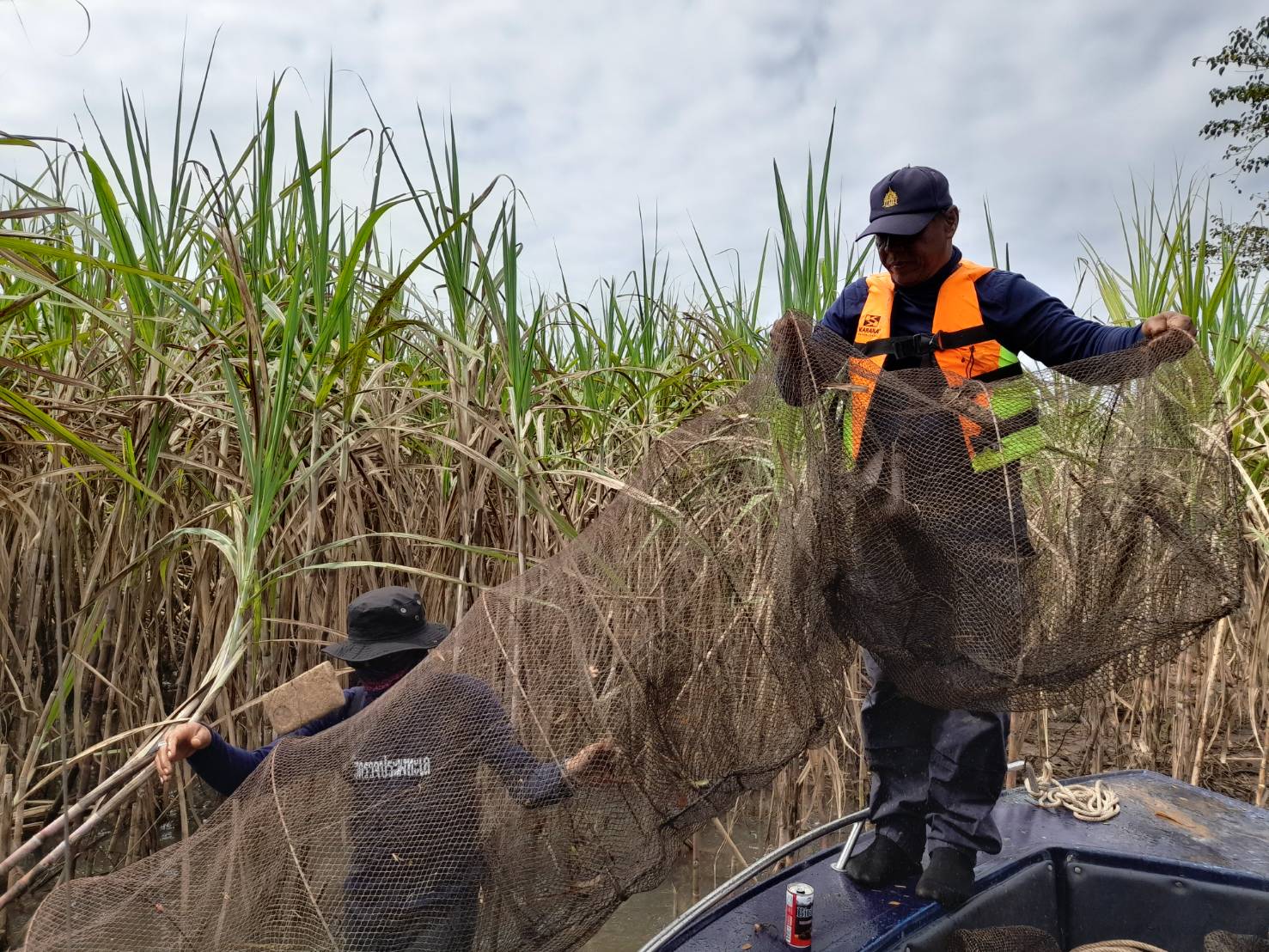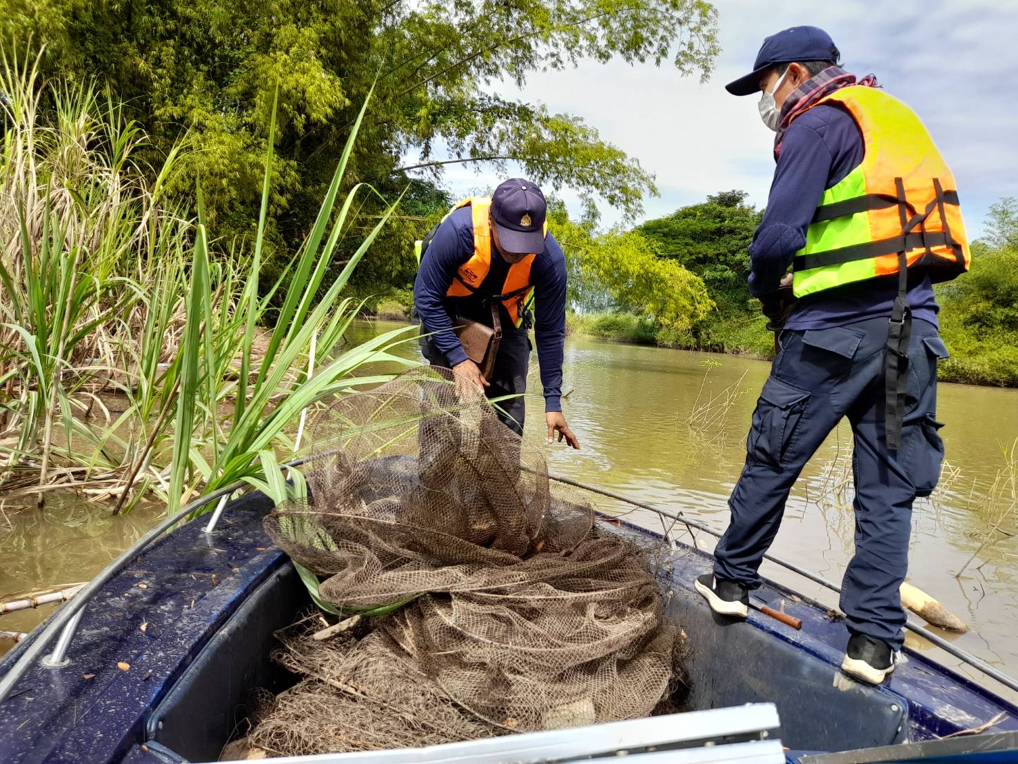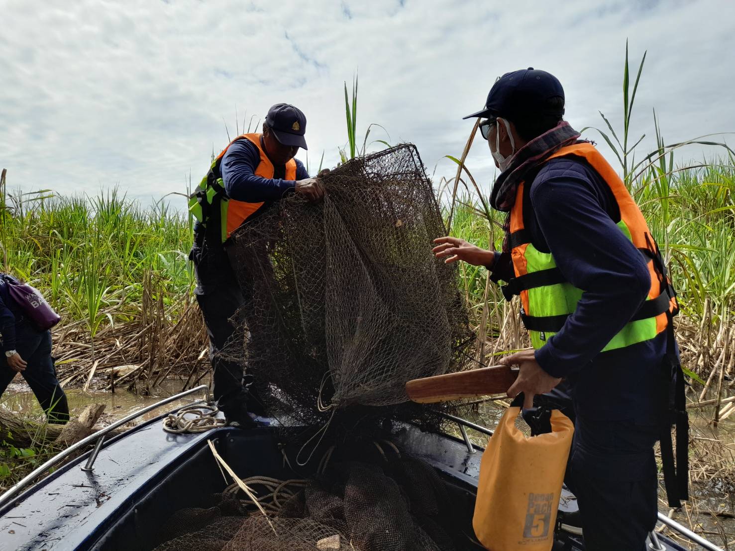 2. รื้อถอนทำลายเครื่องมืออวนกางกั้นทางเดินสัตว์น้ำ จำนวน 1ผืน และยอขันช่อพร้อมงาก้นถุง จำนวน 1 ปาก