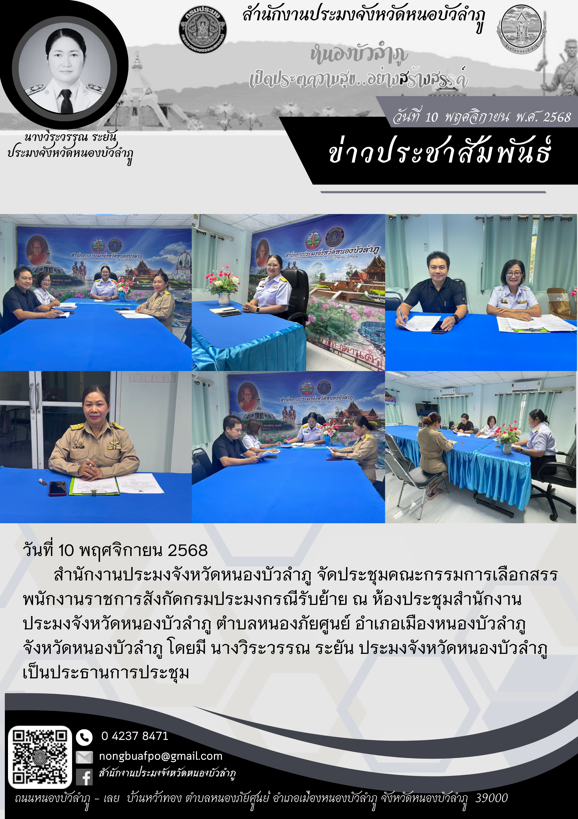 สำนักงานประมงจังหวัดหนองบัวลำภู จัดประชุมคณะกรรมการเลือกสรรพนักงานราชการสังกัดกรมประมงกรณีรับย้าย ณ ห้องประชุมสำนักงานประมงจังหวัดหนองบัวลำภู ตำบลหนองภัยศูนย์ อำเภอเมืองหนองบัวลำภู จังหวัดหนองบัวลำภู โดยมีนางวิระวรรณ ระยัน ประมงจังหวัดหนองบัวลำภู เป็นประธานการประชุม