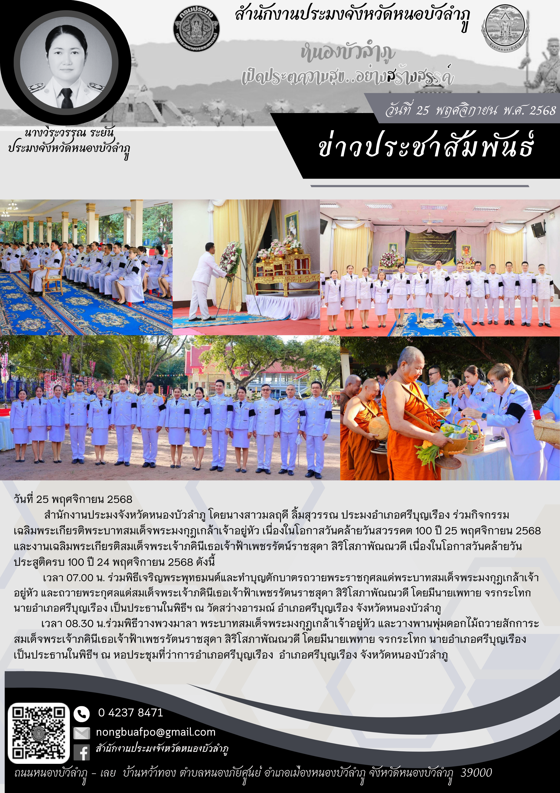 สำนักงานประมงจังหวัดหนองบัวลำภู โดยนางสาวมลฤดี ลิ้มสุวรรณ ประมงอำเภอศรีบุญเรือง ร่วมกิจกรรมเฉลิมพระเกียรติพระบาทสมเด็จพระมงกุฎเกล้าเจ้าอยู่หัว เนื่องในโอกาสวันคล้ายวันสวรรคต 100 ปี 25 พฤศจิกายน 2568 และงานเฉลิมพระเกียรติสมเด็จพระเจ้าภคินีเธอเจ้าฟ้าเพชรรัตน์ราชสุดา สิริโสภาพัณณวดี เนื่องในโอกาสวันคล้ายวันประสูติครบ 100 ปี 24 พฤศจิกายน 2568 ดังนี้
