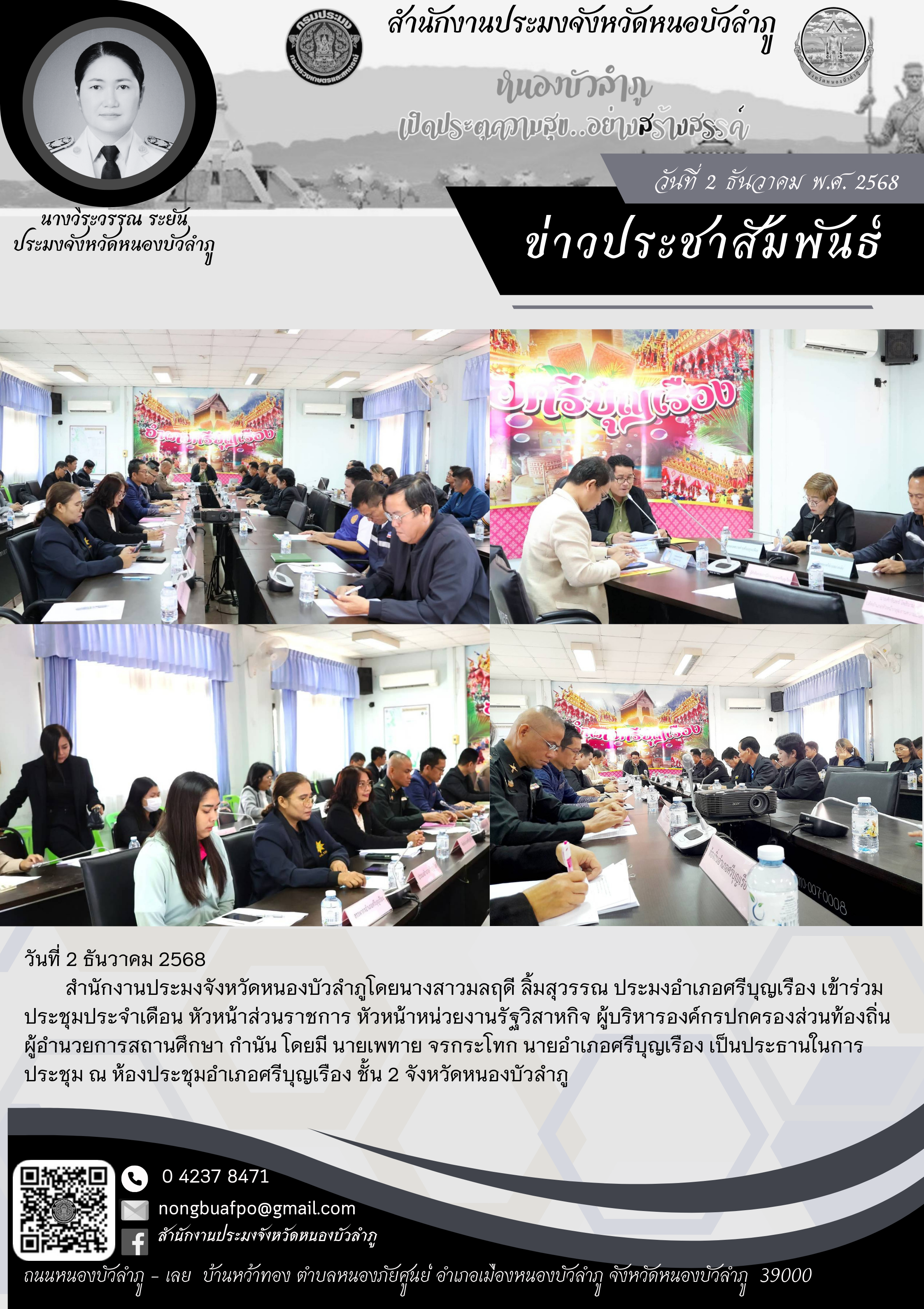 สำนักงานประมงจังหวัดหนองบัวลำภูโดยนางสาวมลฤดี ลิ้มสุวรรณ ประมงอำเภอศรีบุญเรือง เข้าร่วมประชุมประจำเดือน หัวหน้าส่วนราชการ หัวหน้าหน่วยงานรัฐวิสาหกิจ ผู้บริหารองค์กรปกครองส่วนท้องถิ่น ผู้อำนวยการสถานศึกษา กำนัน โดยมีนายเพทาย จรกระโทก นายอำเภอศรีบุญเรือง เป็นประธานในการประชุม ณ ห้องประชุมอำเภอศรีบุญเรือง ชั้น 2 จังหวัดหนองบัวลำภู