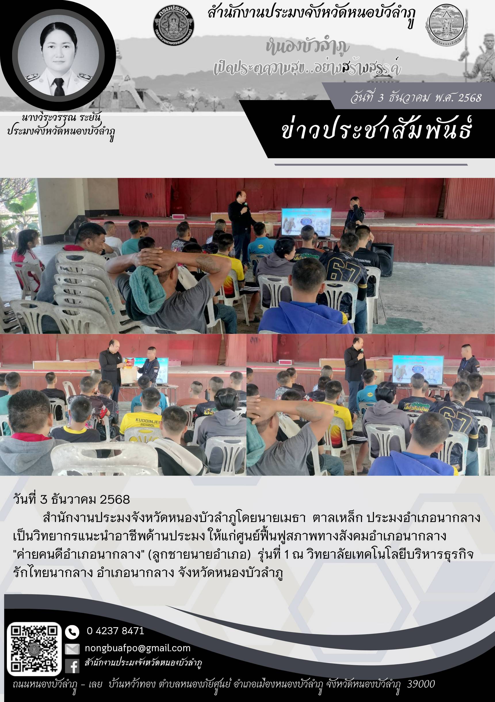 สำนักงานประมงจังหวัดหนองบัวลำภูโดยนายเมธา ตาลเหล็ก ประมงอำเภอนากลาง เป็นวิทยากรแนะนำอาชีพด้านประมง ให้แก่ศูนย์ฟื้นฟูสภาพทางสังคมอำเภอนากลาง "ค่ายคนดีอำเภอนากลาง" (ลูกชายนายอำเภอ) รุ่นที่ 1 ณ วิทยาลัยเทคโนโลยีบริหารธุรกิจรักไทยนากลาง อำเภอนากลาง จังหวัดหนองบัวลำภู