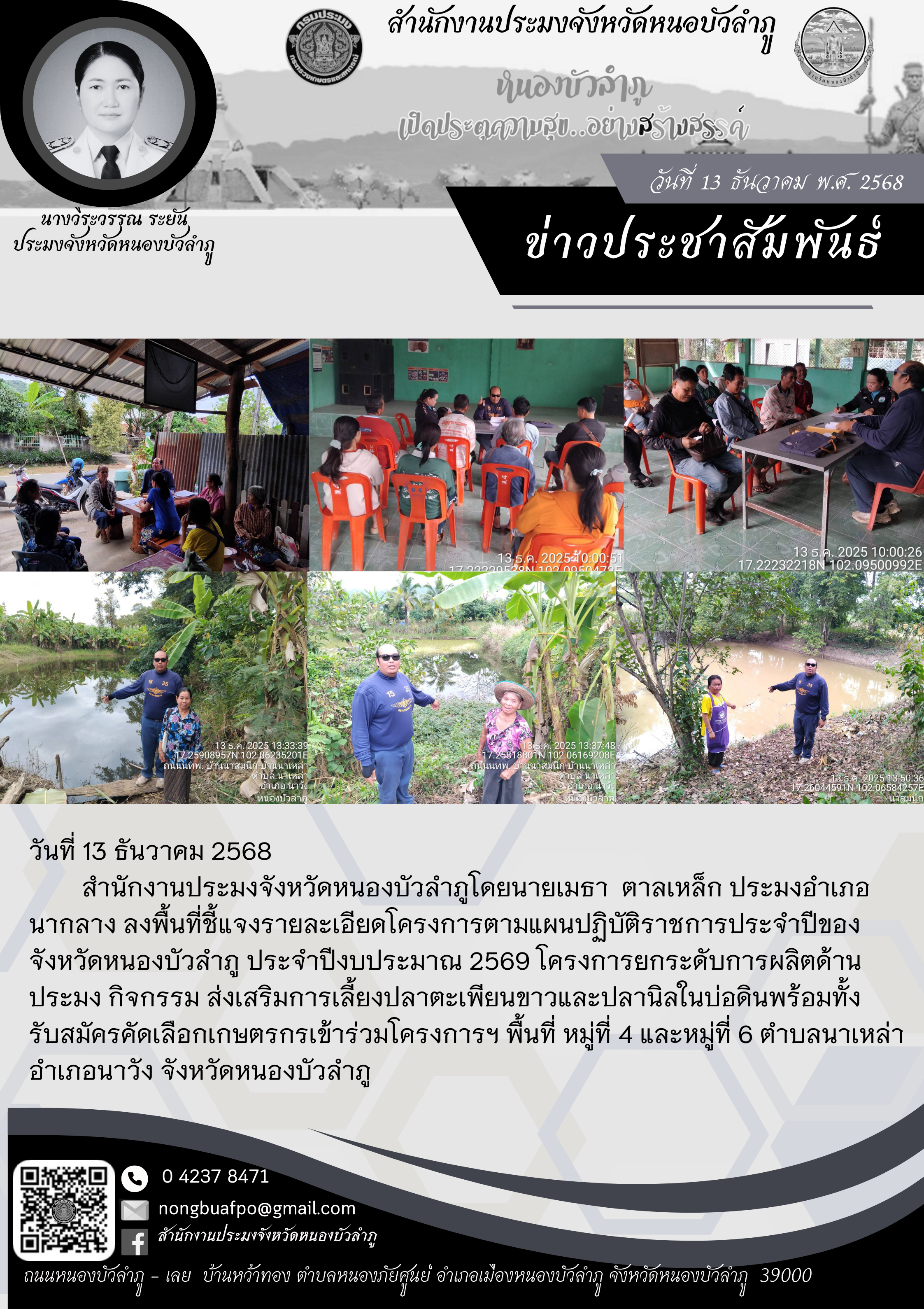 ลงพื้นที่ชี้แจงรายละเอียดโครงการตามแผนปฏิบัติราชการประจำปีของจังหวัดหนองบัวลำภู ประจำปีงบประมาณ 2569 โครงการยกระดับการผลิตด้านประมง กิจกรรม ส่งเสริมการเลี้ยงปลาตะเพียนขาวและปลานิลในบ่อดิน