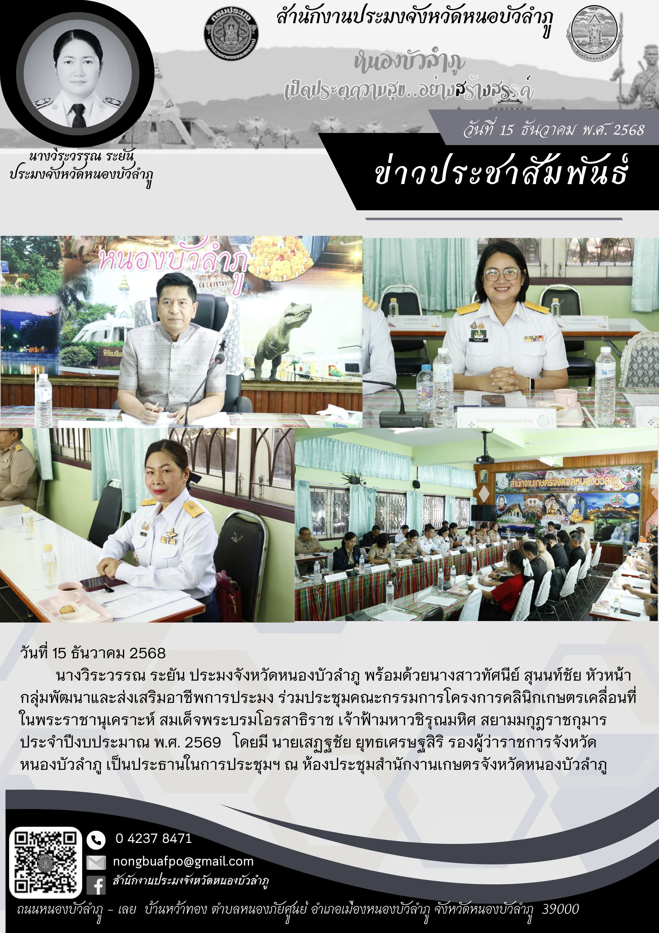 นางวิระวรรณ ระยัน ประมงจังหวัดหนองบัวลำภู พร้อมด้วยนางสาวทัศนีย์ สุนนท์ชัย หัวหน้ากลุ่มพัฒนาและส่งเสริมอาชีพการประมง ร่วมประชุมคณะกรรมการโครงการคลินิกเกษตรเคลื่อนที่ ในพระราชานุเคราะห์ สมเด็จพระบรมโอรสาธิราช เจ้าฟ้ามหาวชิรุณมหิศ สยามมกุฎราชกุมาร ประจำปีงบประมาณ พ.ศ. 2569 โดยมี นายเสฏฐชัย ยุทธเศรษฐสิริ รองผู้ว่าราชการจังหวัดหนองบัวลำภู เป็นประธานในการประชุมฯ ณ ห้องประชุมสำนักงานเกษตรจังหวัดหนองบัวลำภู
