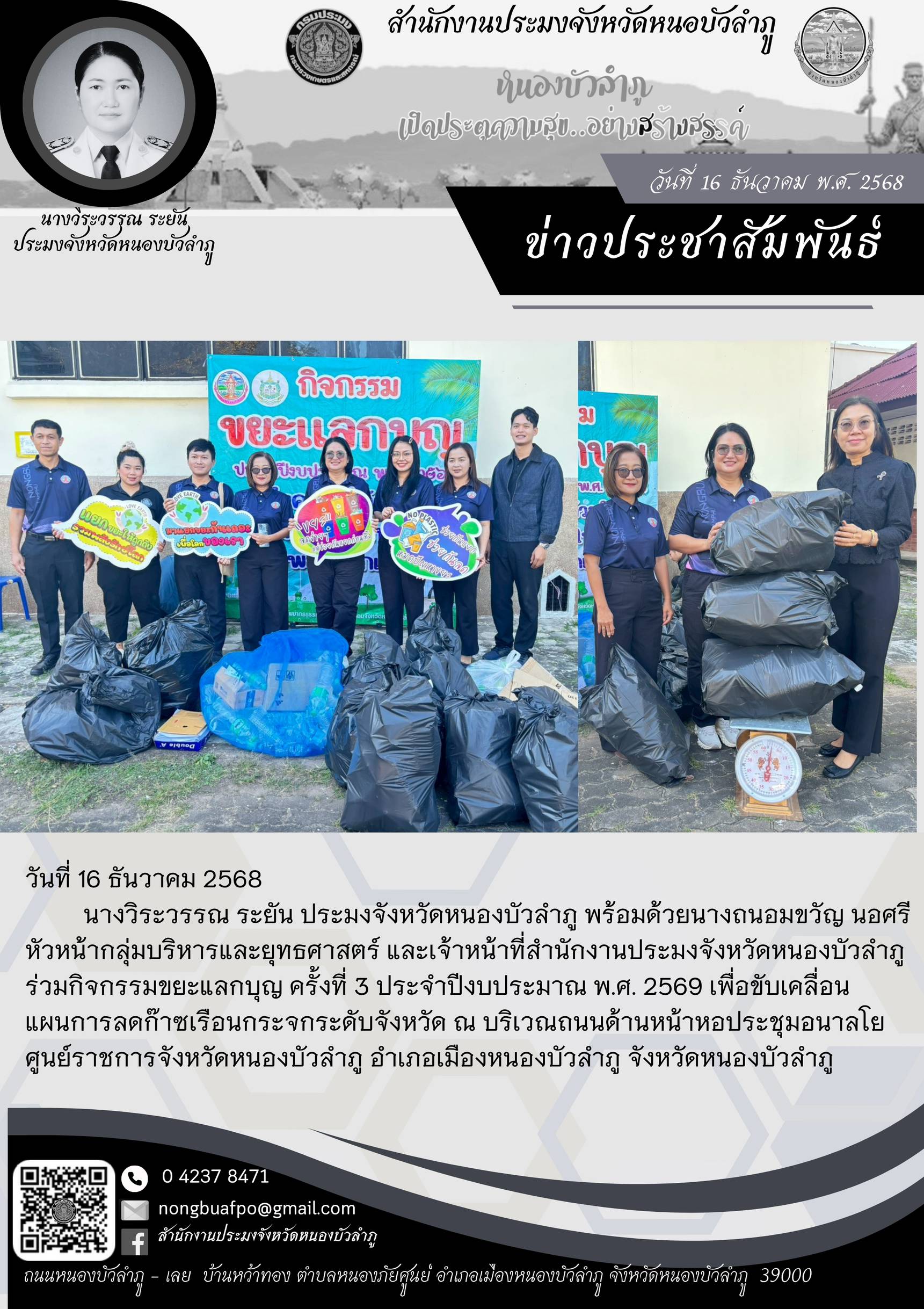 นางวิระวรรณ ระยัน ประมงจังหวัดหนองบัวลำภู พร้อมด้วยนางถนอมขวัญ นอศรี หัวหน้ากลุ่มบริหารและยุทธศาสตร์ และเจ้าหน้าที่สำนักงานประมงจังหวัดหนองบัวลำภู ร่วมกิจกรรมขยะแลกบุญ ครั้งที่ 3 ประจำปีงบประมาณ พ.ศ. 2569 เพื่อขับเคลื่อนแผนการลดก๊าซเรือนกระจกระดับจังหวัด ณ บริเวณถนนด้านหน้าหอประชุมอนาลโย ศูนย์ราชการจังหวัดหนองบัวลำภู อำเภอเมืองหนองบัวลำภู จังหวัดหนองบัวลำภู