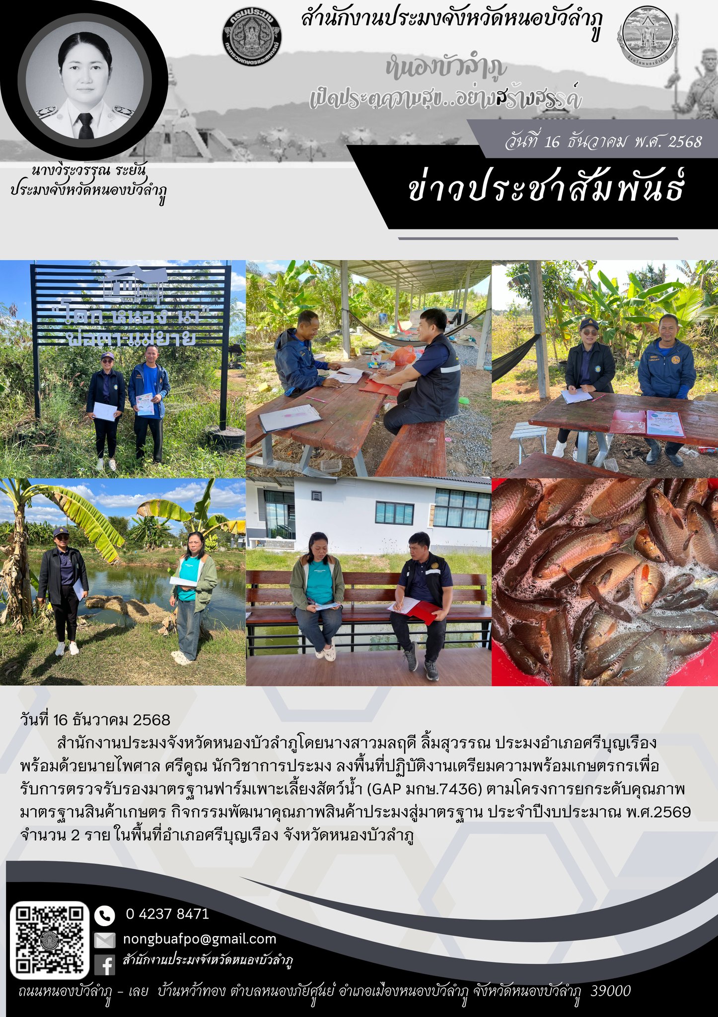 สำนักงานประมงจังหวัดหนองบัวลำภูโดยนางสาวมลฤดี ลิ้มสุวรรณ ประมงอำเภอศรีบุญเรือง พร้อมด้วยนายไพศาล ศรีคูณ นักวิชาการประมง ลงพื้นที่ปฏิบัติงานเตรียมความพร้อมเกษตรกรเพื่อรับการตรวจรับรองมาตรฐานฟาร์มเพาะเลี้ยงสัตว์น้ำ (GAP มกษ.7436) ตามโครงการยกระดับคุณภาพมาตรฐานสินค้าเกษตร กิจกรรมพัฒนาคุณภาพสินค้าประมงสู่มาตรฐาน ประจำปีงบประมาณ พ.ศ.2569 จำนวน 2 ราย ในพื้นที่อำเภอศรีบุญเรือง จังหวัดหนองบัวลำภู