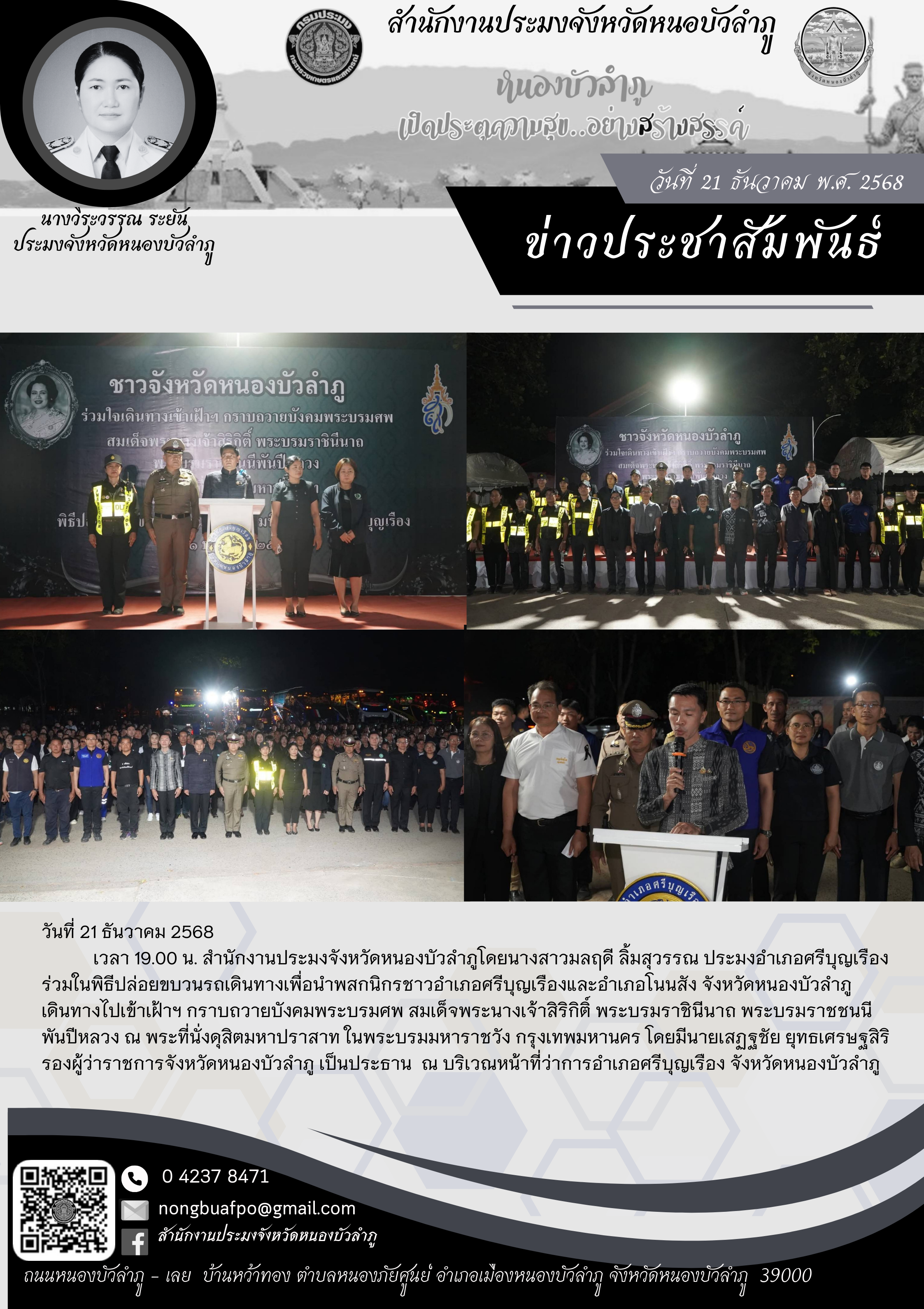 NEW วมในพิธีปล่อยขบวนรถเดินทางเพื่อนำพสกนิกรชาวอำเภอศรีบุญเรืองและอำเภอโนนสัง จังหวัดหนองบัวลำภู เดินทางไปเข้าเฝ้าฯ กราบถวายบังคมพระบรมศพ สมเด็จพระนางเจ้าสิริกิติ์ พระบรมราชินีนาถ พระบรมราชชนนีพันปีหลวง..คลิก