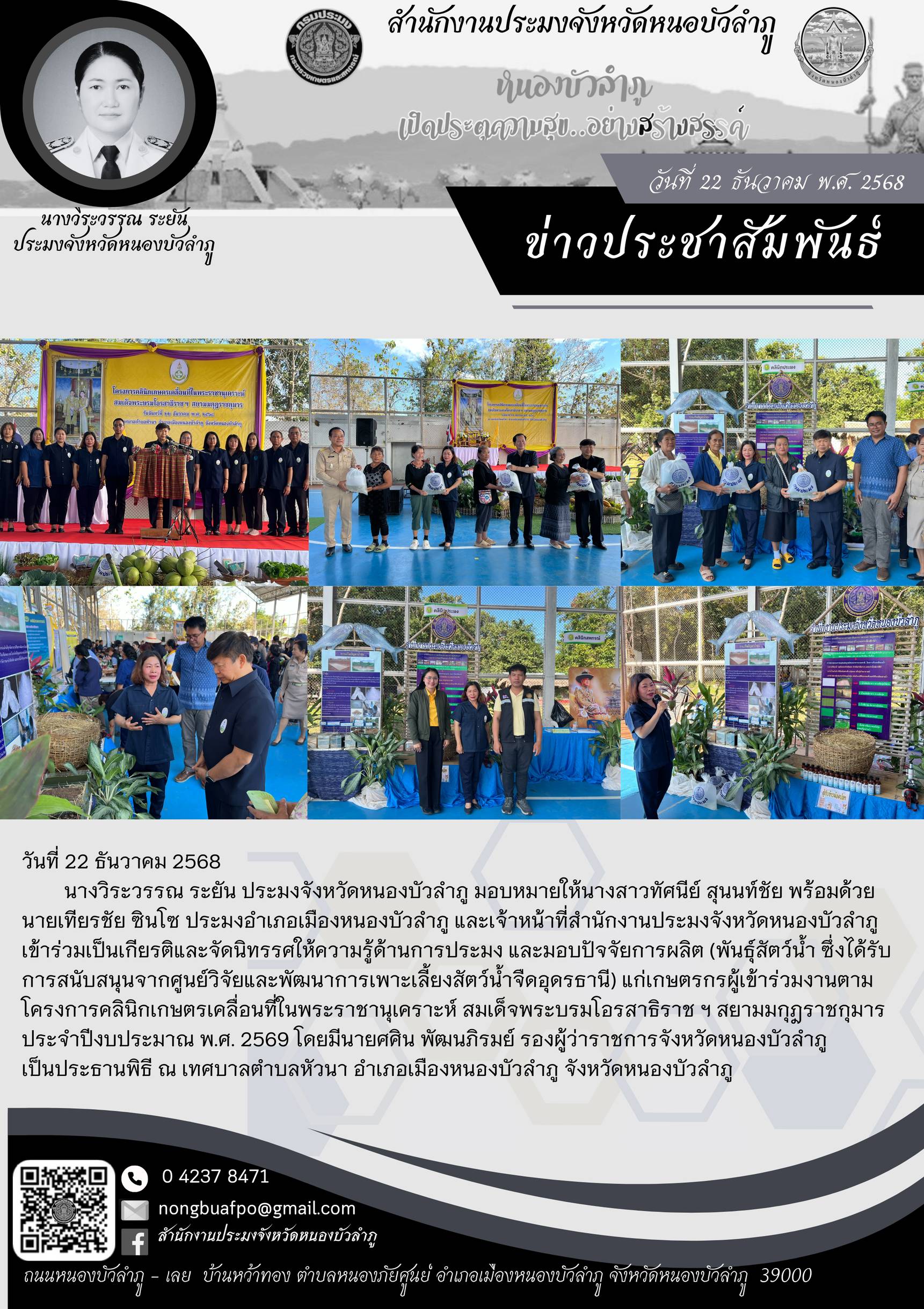 นางวิระวรรณ ระยัน ประมงจังหวัดหนองบัวลำภู มอบหมายให้นางสาวทัศนีย์ สุนนท์ชัย พร้อมด้วยนายเทียรชัย ซินโซ ประมงอำเภอเมืองหนองบัวลำภู และเจ้าหน้าที่สำนักงานประมงจังหวัดหนองบัวลำภู เข้าร่วมเป็นเกียรติและจัดนิทรรศให้ความรู้ด้านการประมง และมอบปัจจัยการผลิต (พันธุ์สัตว์น้ำ ซึ่งได้รับการสนับสนุนจากศูนย์วิจัยและพัฒนาการเพาะเลี้ยงสัตว์น้ำจืดอุดรธานี) แก่เกษตรกรผู้เข้าร่วมงานตามโครงการคลินิกเกษตรเคลื่อนที่ในพระราชานุเคราะห์ สมเด็จพระบรมโอรสาธิราช ฯ สยามมกุฎราชกุมาร ประจำปีงบประมาณ พ.ศ. 2569 โดยมีนายศศิน พัฒนภิรมย์ รองผู้ว่าราชการจังหวัดหนองบัวลำภู เป็นประธานพิธีฯ ณ เทศบาลตำบลหัวนา อำเภอเมืองหนองบัวลำภู จังหวัดหนองบัวลำภู