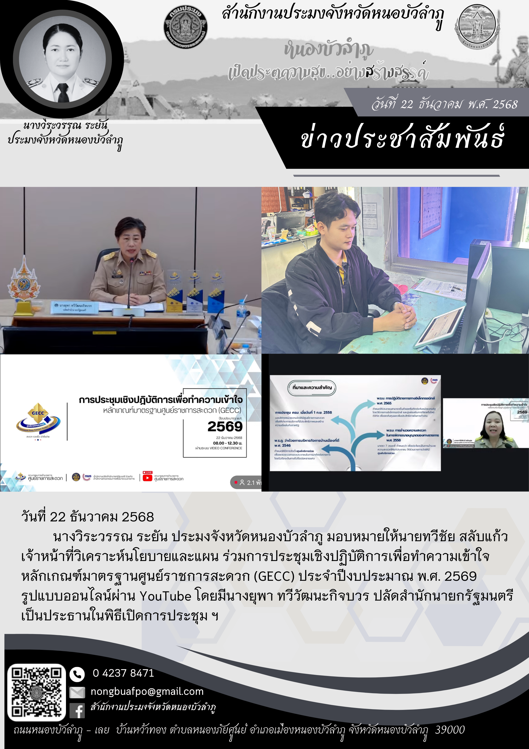 นางวิระวรรณ ระยัน ประมงจังหวัดหนองบัวลำภู มอบหมายให้นายทวีชัย สลับแก้ว เจ้าหน้าที่วิเคราะห์นโยบายและแผน ร่วมการประชุมเชิงปฏิบัติการเพื่อทำความเข้าใจหลักเกณฑ์มาตรฐานศูนย์ราชการสะดวก (GECC) ประจำปีงบประมาณ พ.ศ. 2569 รูปแบบออนไลน์ผ่าน YouTube โดยมีนางยุพา ทวีวัฒนะกิจบวร ปลัดสำนักนายกรัฐมนตรี เป็นประธานในพิธีเปิดการประชุม ฯ