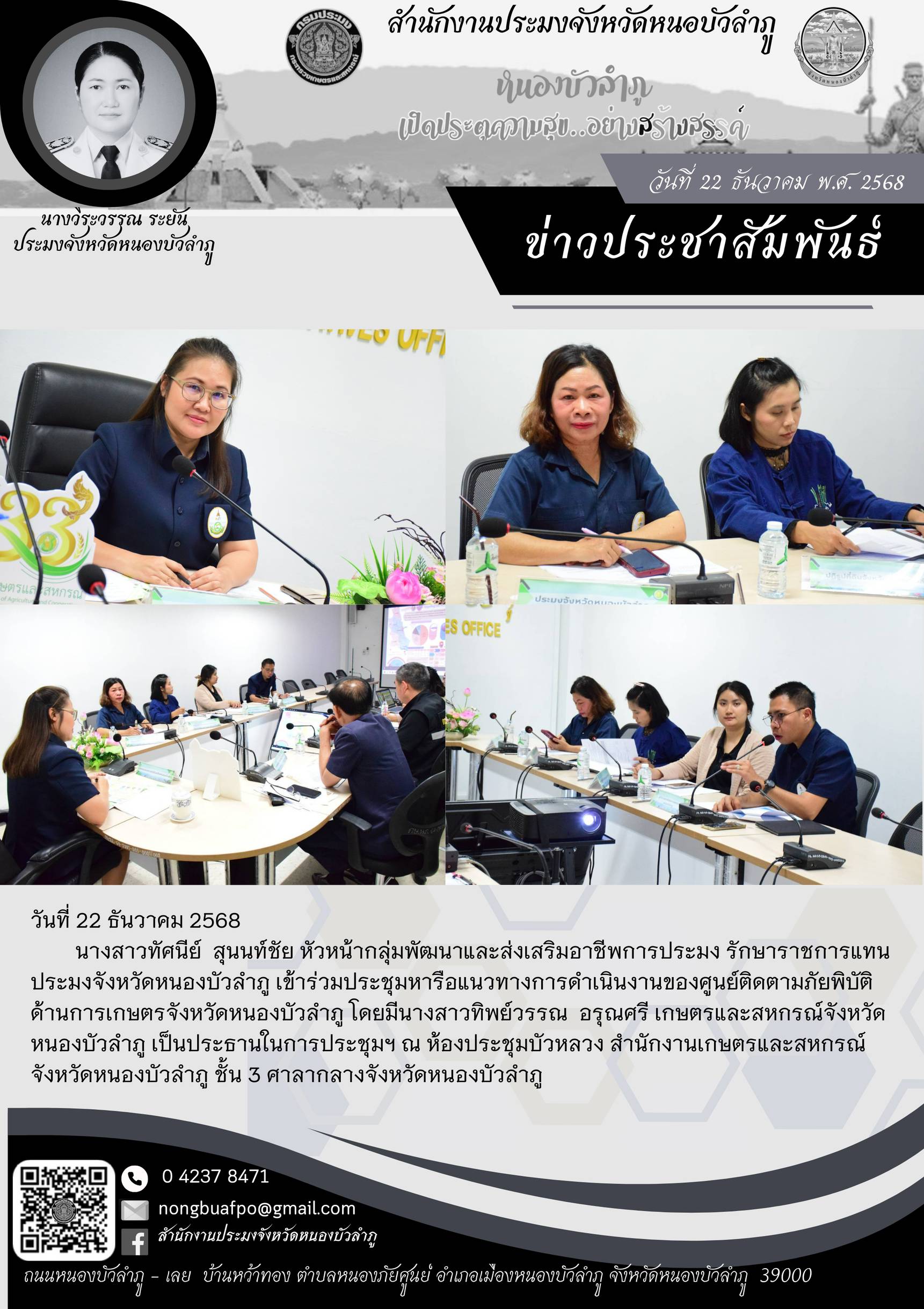NEW เข้าร่วมประชุมหารือแนวทางการดำเนินงานของศูนย์ติดตามภัยพิบัติด้านการเกษตรจังหวัดหนองบัวลำภู..คลิก