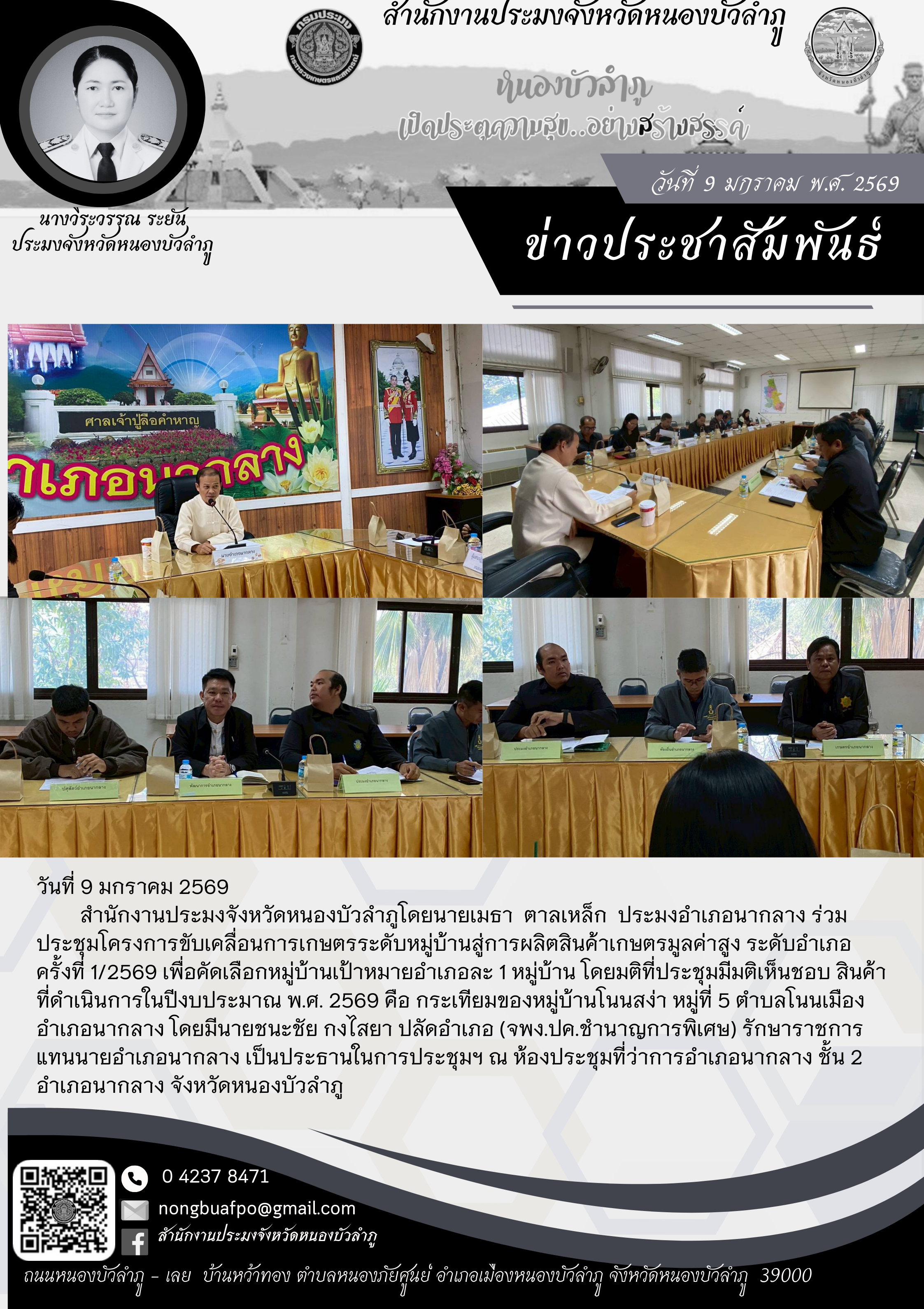 สำนักงานประมงจังหวัดหนองบัวลำภูโดยนายเมธา ตาลเหล็ก ประมงอำเภอนากลาง ร่วมประชุมโครงการขับเคลื่อนการเกษตรระดับหมู่บ้านสู่การผลิตสินค้าเกษตรมูลค่าสูง ระดับอำเภอ ครั้งที่ 1/2569 เพื่อคัดเลือกหมู่บ้านเป้าหมายอำเภอละ 1 หมู่บ้าน โดยมติที่ประชุมมีมติเห็นชอบ สินค้าที่ดำเนินการในปีงบประมาณ พ.ศ. 2569 คือ กระเทียมของหมู่บ้านโนนสง่า หมู่ที่ 5 ตำบลโนนเมือง อำเภอนากลาง โดยมีนายชนะชัย กงไสยา ปลัดอำเภอ (จพง.ปค.ชำนาญการพิเศษ) รักษาราชการแทนนายอำเภอนากลาง เป็นประธานในการประชุมฯ ณ ห้องประชุมที่ว่าการอำเภอนากลาง ชั้น 2 อำเภอนากลาง จังหวัดหนองบัวลำภู