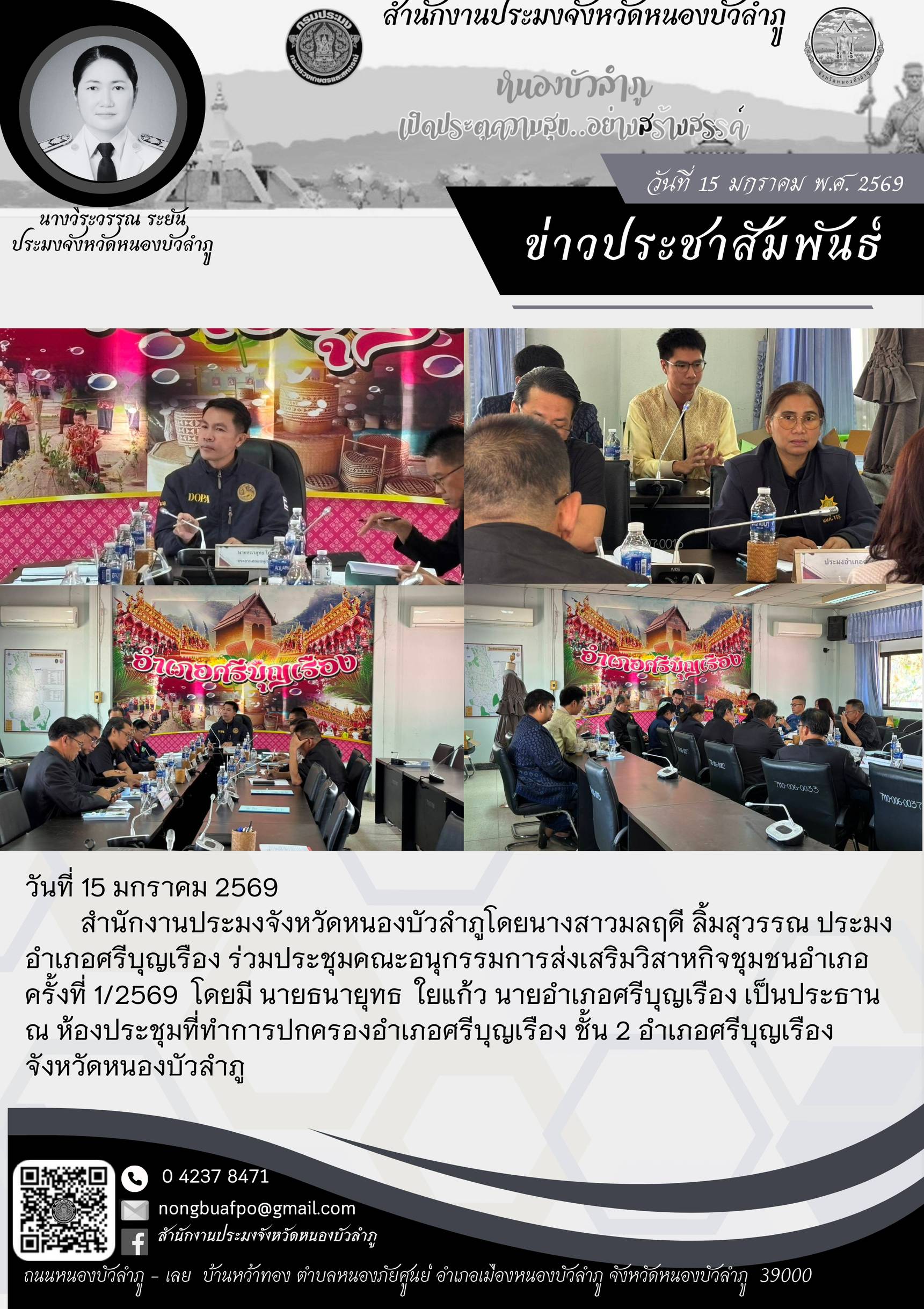 สำนักงานประมงจังหวัดหนองบัวลำภูโดยนางสาวมลฤดี ลิ้มสุวรรณ ประมงอำเภอศรีบุญเรือง ร่วมประชุมคณะอนุกรรมการส่งเสริมวิสาหกิจชุมชนอำเภอ ครั้งที่ 1/2569 โดยมีนายธนายุทธ ใยแก้ว นายอำเภอศรีบุญเรือง เป็นประธาน ณ ห้องประชุมที่ทำการปกครองอำเภอศรีบุญเรือง ชั้น 2 อำเภอศรีบุญเรือง จังหวัดหนองบัวลำภู