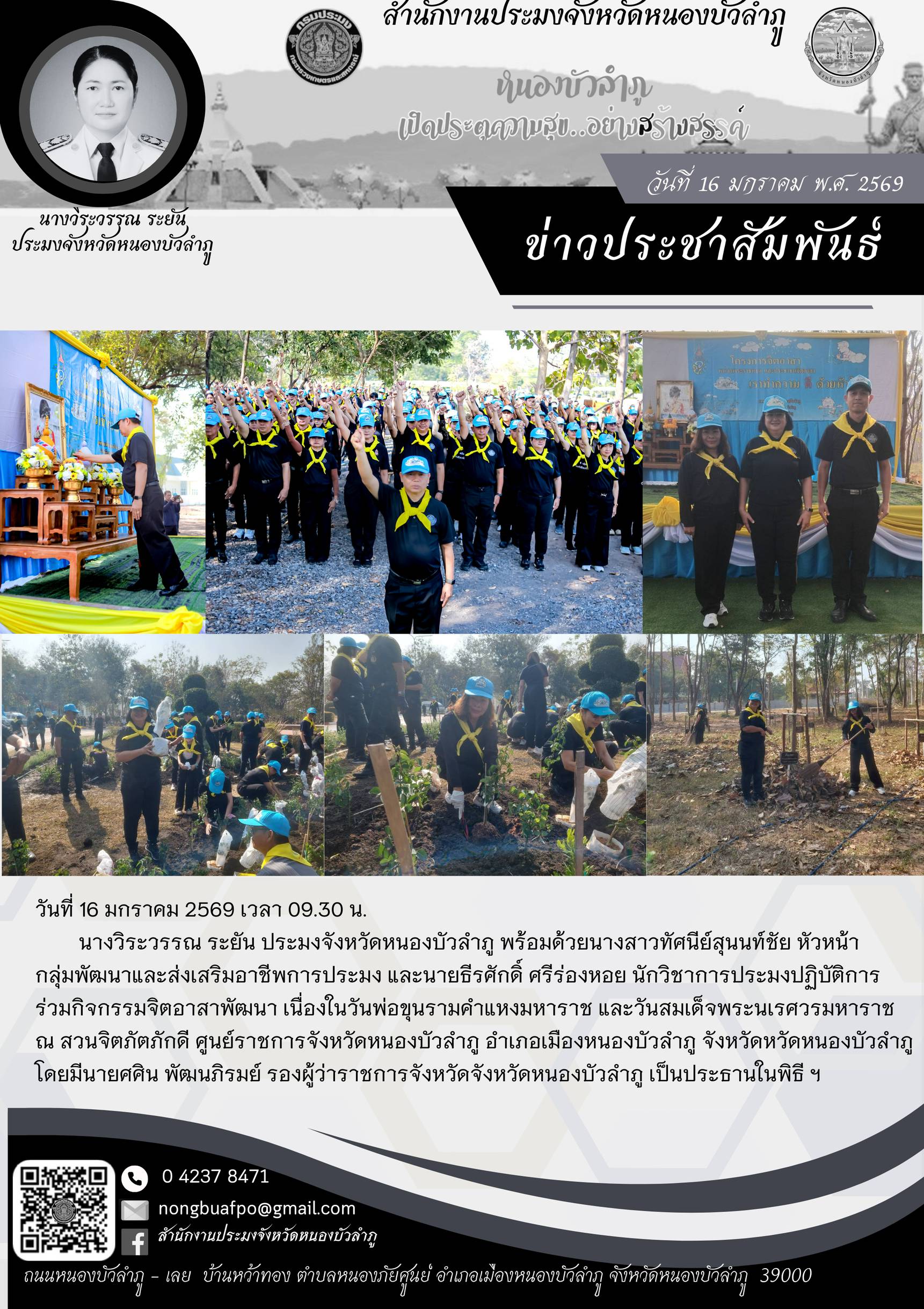 นางวิระวรรณ ระยัน ประมงจังหวัดหนองบัวลำภู พร้อมด้วยนางสาวทัศนีย์สุนนท์ชัย หัวหน้า กลุ่มพัฒนาและส่งเสริมอาชีพการประมง และนายธีรศักดิ์ ศรีร่องหอย นักวิชาการประมงปฏิบัติการ ร่วมกิจกรรมจิตอาสาพัฒนา เนื่องในวันพ่อขุนรามคำแหงมหาราช และวันสมเด็จพระนเรศวรมหาราช ณ สวนจิตภัตภักดี ศูนย์ราชการจังหวัดหนองบัวลำภู อำเภอเมืองหนองบัวลำภู จังหวัดหวัดหนองบัวลำภู โดยมีนายศศิน พัฒนภิรมย์ รองผู้ว่าราชการจังหวัดจังหวัดหนองบัวลำภู เป็นประธานในพิธี ฯ