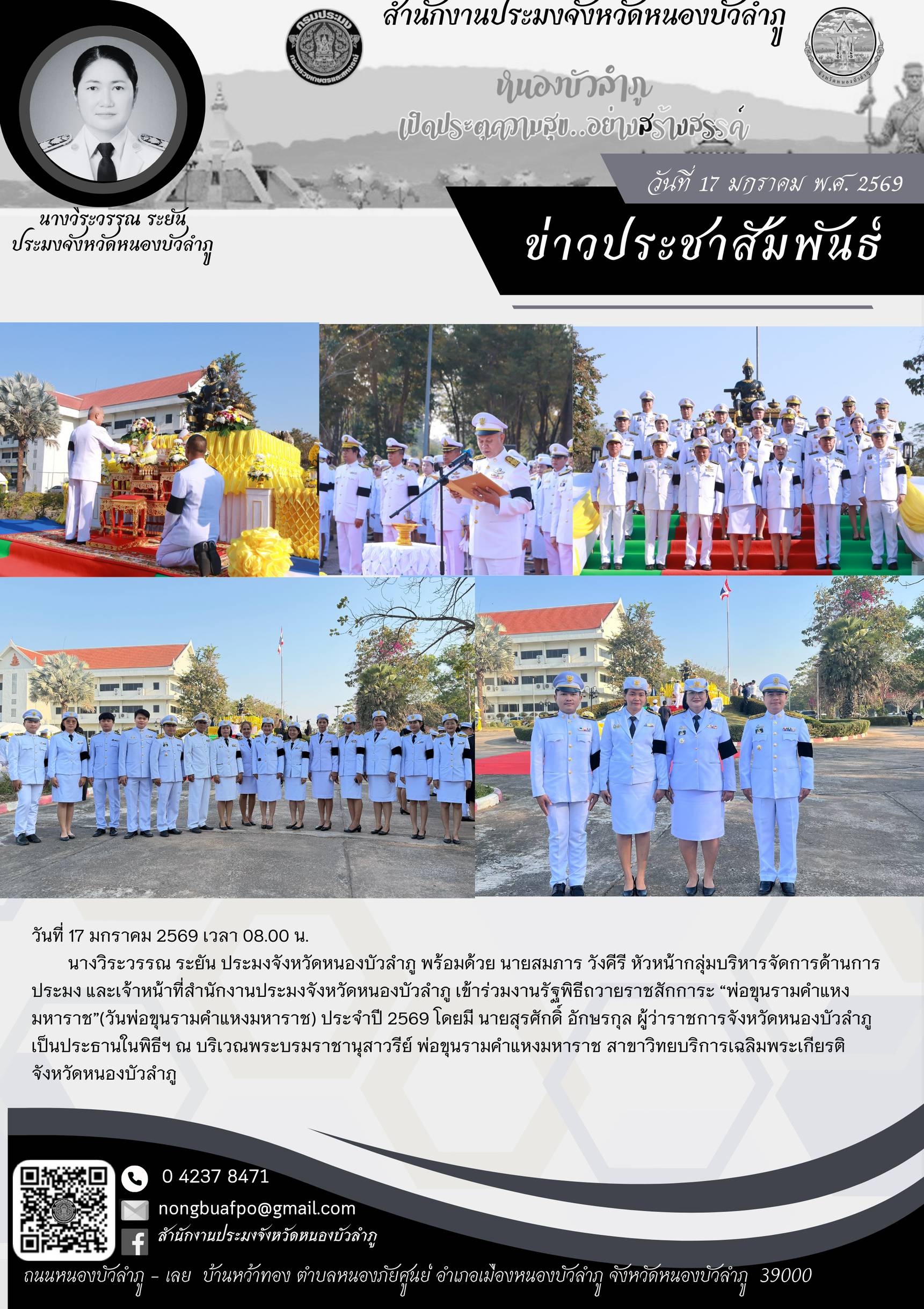 นางวิระวรรณ ระยัน ประมงจังหวัดหนองบัวลำภู พร้อมด้วย นายสมภาร วังคีรี หัวหน้ากลุ่มบริหารจัดการด้านการประมง และเจ้าหน้าที่สำนักงานประมงจังหวัดหนองบัวลำภู เข้าร่วมงานรัฐพิธีถวายราชสักการะ “พ่อขุนรามคำแหงมหาราช”(วันพ่อขุนรามคำแหงมหาราช) ประจำปี 2569 โดยมี นายสุรศักดิ์ อักษรกุล ผู้ว่าราชการจังหวัดหนองบัวลำภู เป็นประธานในพิธีฯ ณ บริเวณพระบรมราชานุสาวรีย์ พ่อขุนรามคำแหงมหาราช สาขาวิทยบริการเฉลิมพระเกียรติจังหวัดหนองบัวลำภู