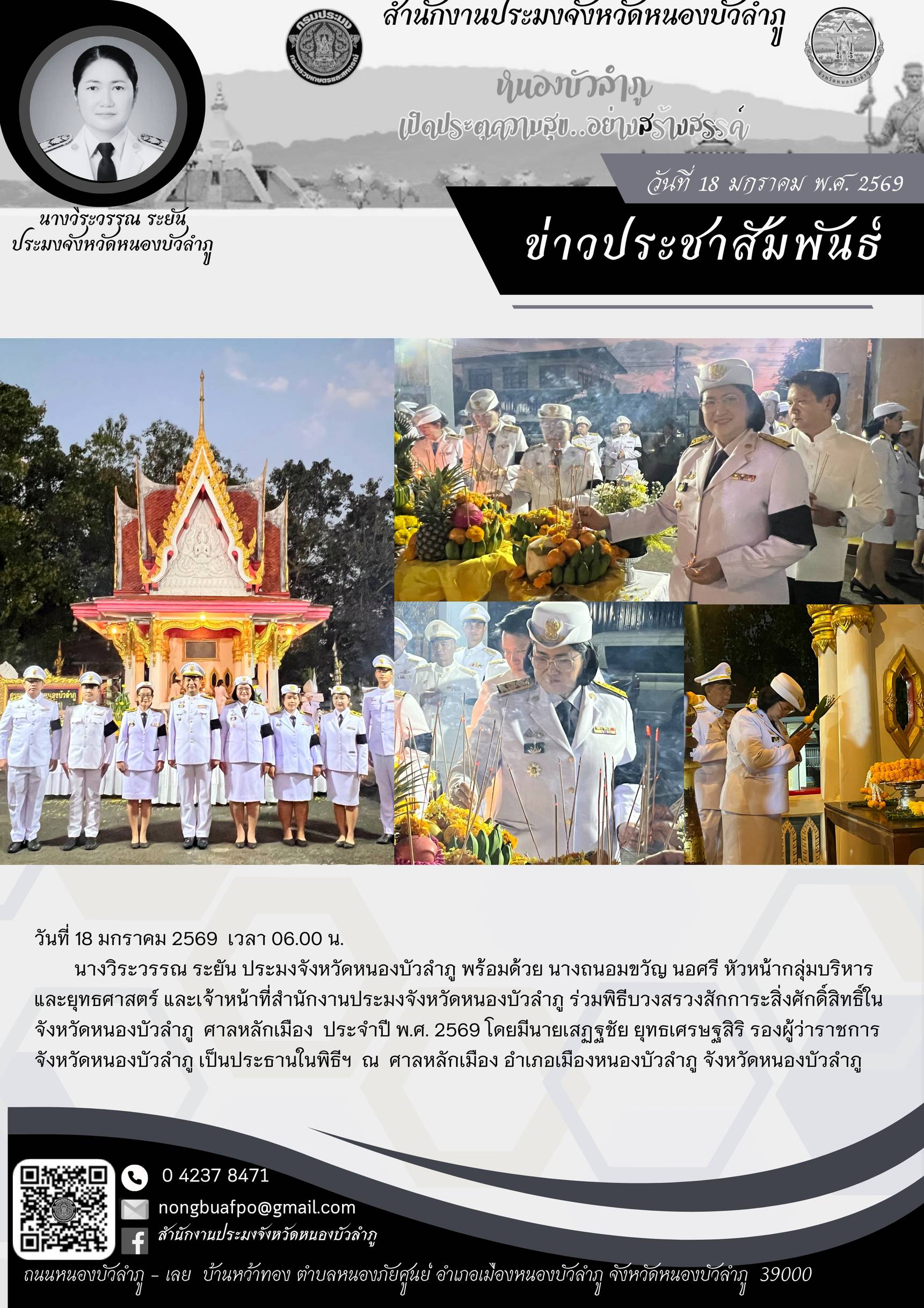 นางวิระวรรณ ระยัน ประมงจังหวัดหนองบัวลำภู พร้อมด้วย นางถนอมขวัญ นอศรี หัวหน้ากลุ่มบริหาร และยุทธศาสตร์ และเจ้าหน้าที่สำนักงานประมงจังหวัดหนองบัวลำภู ร่วมพิธีบวงสรวงดวงพระวิญญาณสมเด็จพระนเรศวรมหาราชและสักการะสิ่งศักดิ์สิทธิ์ ประจำจังหวัด ประจำปี พ.ศ. 2569 ณ จุดที่ 3 ศาลหลักเมือง โดยมีนายเสฏฐชัย ยุทธเศรษฐสิริ รองผู้ว่าราชการจังหวัดหนองบัวลำภู เป็นประธานในพิธีฯ ณ ศาลหลักเมือง อำเภอเมืองหนองบัวลำภู จังหวัดหนองบัวลำภู