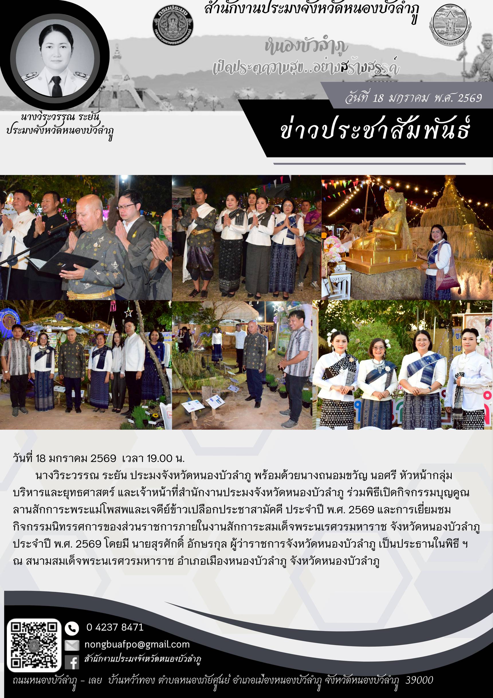 ร่วมพิธีเปิดกิจกรรมบุญคูณลานสักการะพระแม่โพสพและเจดีย์ข้าวเปลือกประชาสามัคคี ประจำปี พ.ศ. 2569 และการเยี่ยมชมกิจกรรมนิทรรศการของส่วนราชการภายในงานสักการะสมเด็จพระนเรศวรมหาราช จังหวัดหนองบัวลำภู ประจำปี พ.ศ. 2569