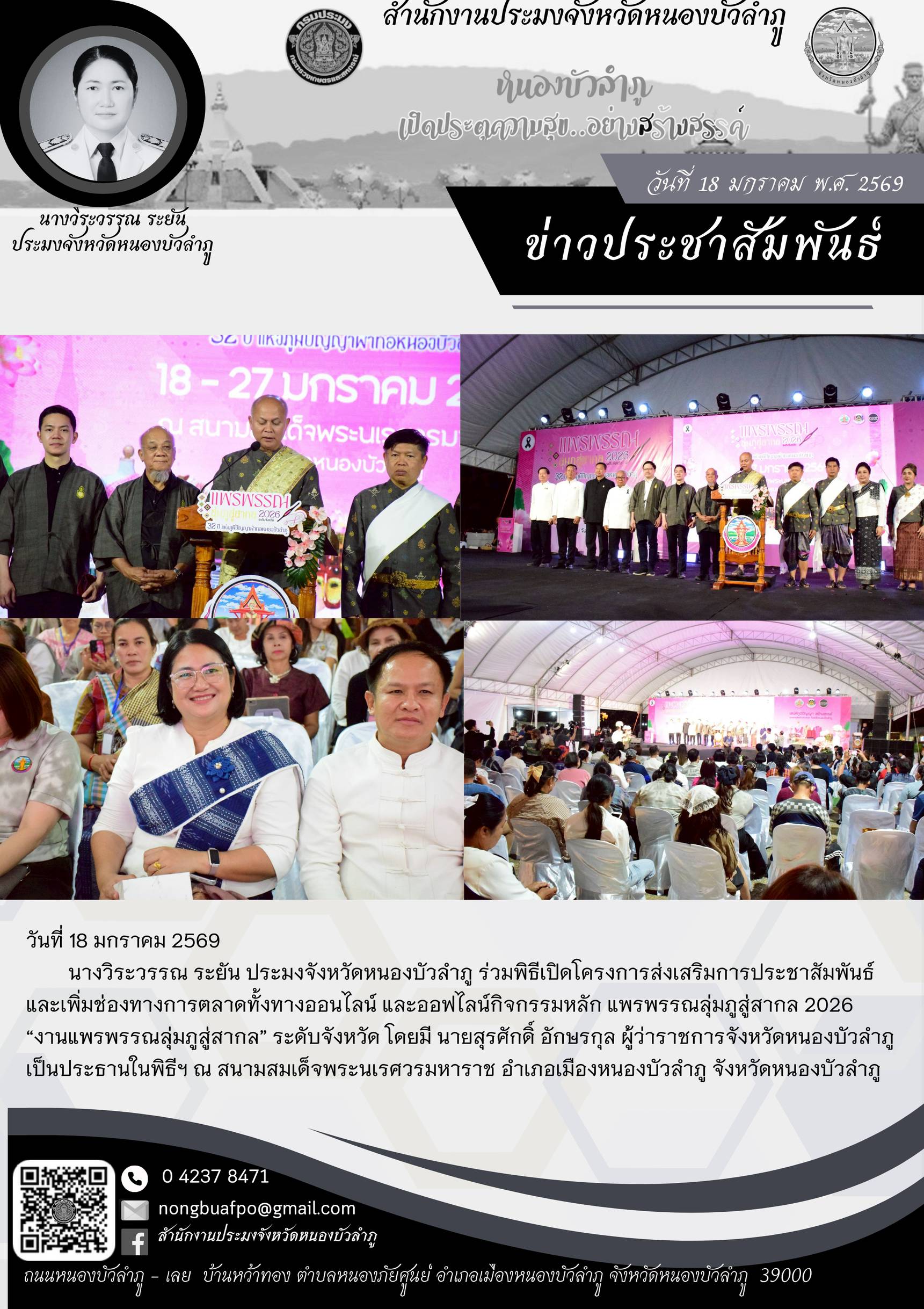 ร่วมพิธีเปิดโครงการส่งเสริมการประชาสัมพันธ์และเพิ่มช่องทางการตลาดทั้งทางออนไลน์ และออฟไลน์กิจกรรมหลัก แพรพรรณลุ่มภูสู่สากล 2026 “งานแพรพรรณลุ่มภูสู่สากล” ระดับจังหวัด..คลิก