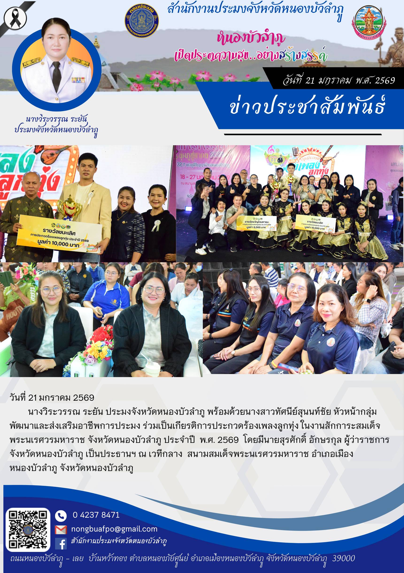 นางวิระวรรณ ระยัน ประมงจังหวัดหนองบัวลำภู พร้อมด้วยนางสาวทัศนีย์สุนนท์ชัย หัวหน้ากลุ่มพัฒนาและส่งเสริมอาชีพการประมง ร่วมเป็นเกียรติการประกวดร้องเพลงลูกทุ่ง ในงานสักการะสมเด็จพระนเรศวรมหาราช จังหวัดหนองบัวลำภู ประจำปี พ.ศ. 2569 โดยมีนายสุรศักดิ์ อักษรกุล ผู้ว่าราชการจังหวัดหนองบัวลำภู เป็นประธานฯ ณ เวทีกลาง สนามสมเด็จพระนเรศวรมหาราช อำเภอเมืองหนองบัวลำภู จังหวัดหนองบัวลำภู