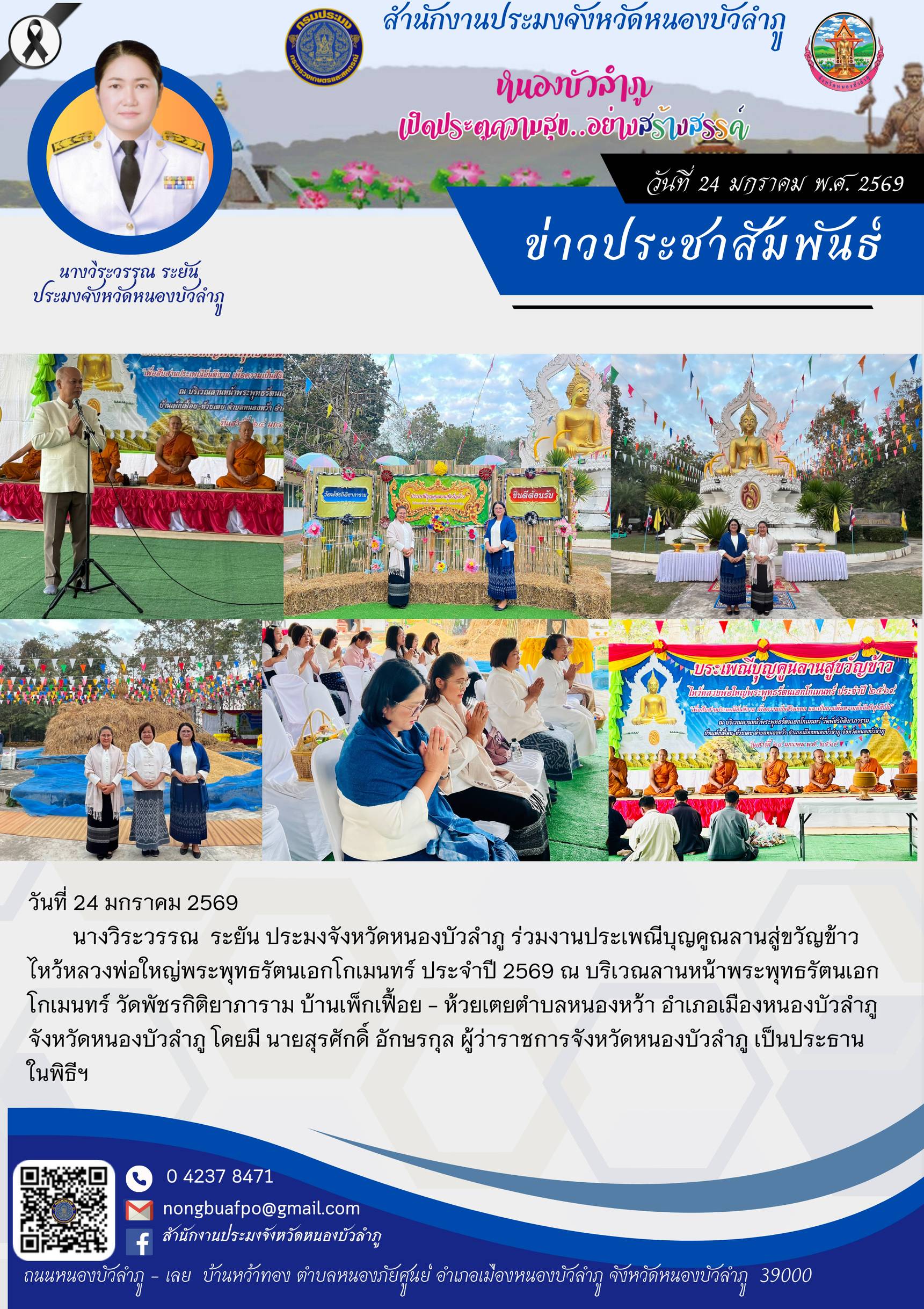 นางวิระวรรณ ระยัน ประมงจังหวัดหนองบัวลำภู ร่วมงานประเพณีบุญคูณลานสู่ขวัญข้าวไหว้หลวงพ่อใหญ่พระพุทธรัตนเอกโกเมนทร์ ประจำปี 2569 ณ บริเวณลานหน้าพระพุทธรัตนเอกโกเมนทร์ วัดพัชรกิติยาภาราม บ้านเพ็กเฟื้อย - ห้วยเตยตำบลหนองหว้า อำเภอเมืองหนองบัวลำภู จังหวัดหนองบัวลำภู โดยมี นายสุรศักดิ์ อักษรกุล ผู้ว่าราชการจังหวัดหนองบัวลำภู เป็นประธานในพิธีฯ
