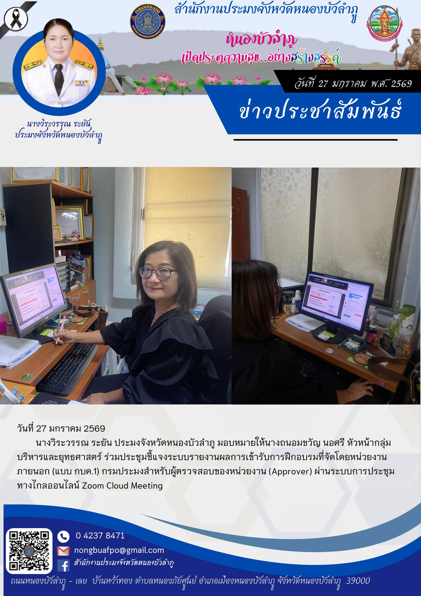 นางวิระวรรณ ระยัน ประมงจังหวัดหนองบัวลำภู มอบหมายให้นางถนอมขวัญ นอศรี หัวหน้ากลุ่มบริหารและยุทธศาสตร์ ร่วมประชุมชี้แจงระบบรายงานผลการเข้ารับการฝึกอบรมที่จัดโดยหน่วยงานภายนอก (แบบ กบค.1) กรมประมงสำหรับผู้ตรวจสอบของหน่วยงาน (Approver) ผ่านระบบการประชุมทางไกลออนไลน์ Zoom Cloud Meeting